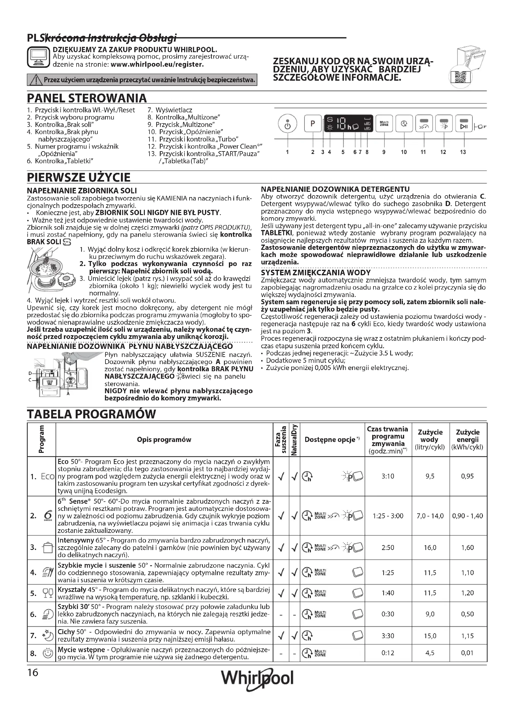 Zmywarka nie napełnia się wodą. Na wyświetlaczu widocz- ny jest komunikat: Dioda H, 6 iWł./Wył. szybko migają. Brak wody wsieci wodociągowej lub zawór jest zamknięty. Sprawdzić, czy woda dopływa zsieci wodociągowej lub czy zawór jest otwarty. Wąż dopływowy jest zagięty. Sprawdzić czy wąż dopływowy nie jest zagięty (zobacz INSTALACJA), następnie ponow- nie zaprogramować iwłączyć zmywarkę. Sitko wwężu dopływowym wody jest zapchane; niezbędne jest jego oczyszczenie. Po wykonaniu sprawdzenia ioczyszczenia należy wyłączyć iwłączyć zmywarkę, irozpo- cząć nowy program. Zmywarka kończy cykl przedwcześnie Na wyświetlaczu widocz- ny jest komunikat: Dioda 15 iWł./Wył. szybko migają. Wąż dopływowy ustawiony jest zbyt nisko lub zasysa do kanalizacji domowej. Sprawdzić czy końcówka węża dopływowego umieszczona jest na prawidłowej wysoko- ści (zobacz INSTALACJA). Należy sprawdzić pod kątem zasysania do kanalizacji domowej, wrazie potrzeby zainstalować zawór wpustowy. Powietrze wdopływie wody. Sprawdzić układ doprowadzania wody pod kątem wycieków lub innych problemów mogących wiązać się zprzepuszczaniem powietrza. Jeśli zmywarka nie działa prawidłowo, należy sprawdzić czy problem można rozwiązać wykonując czynności opisane poniżej. Wprzypadku błę- dów lub problemów prosimy skontaktować się zzakładem serwisowym, którego dane kontaktowe można odnaleźć wksiążeczce gwarancyjnej. Części zamienne będą dostępne przez okres do 7 lub do 10 lat, zgodnie zokreślonymi wymaganiami rozporządzenia. USUWANIE USTEREK Zeskanuj kod QR na swoim urządzeniu, aby uzyskać bardziej szczegółowe informacje.PLSkrócona Instrukcja Obsługi