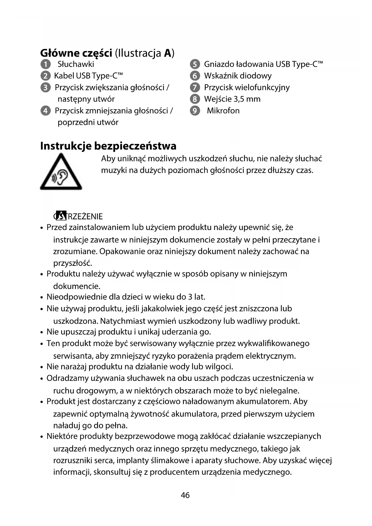 Przewodnik Szybki start Dziecięce słuchawki nauszne HPBT4000BK Więcej informacji znajdziesz w rozszerzonej instrukcji obsługi online: ned.is/hpbt4000bk Przeznaczenie Nedis HPBT4000BK to bezprzewodowe słuchawki nauszne o ograniczonej głośności. Produkt można sparować z dowolnym urządzeniem audio / wideo z funkcją Bluetooth®. Słuchawek można używać do prowadzenia rozmów telefonicznych, jeśli są podłączone do telefonu. Produkt jest przeznaczony wyłącznie do użytku wewnątrz pomieszczeń. Wszelkie modykacje produktu mogą mieć wpływ na bezpieczeństwo, gwarancję i działanie.46 Główne części (Ilustracja A) 1 Słuchawki 2 Kabel USB Type-C™ 3 Przycisk zwiększania głośności / następny utwór 4 Przycisk zmniejszania głośności / poprzedni utwór 5 Gniazdo ładowania USB Type-C™ 6 Wskaźnik diodowy 7 Przycisk wielofunkcyjny 8 Wejście 3,5 mm 9 Mikrofon Instrukcje bezpieczeństwa Aby uniknąć możliwych uszkodzeń słuchu, nie należy słuchać muzyki na dużych poziomach głośności przez dłuższy czas.