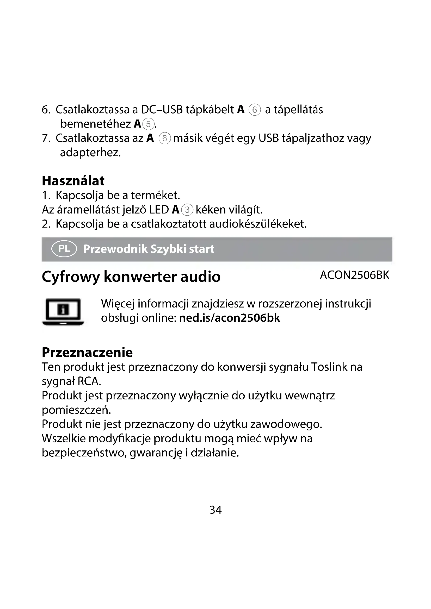 Przewodnik Szybki start Cyfrowy konwerter audio ACON2506BK Więcej informacji znajdziesz w rozszerzonej instrukcji obsługi online: ned.is/acon2506bk Przeznaczenie Ten produkt jest przeznaczony do konwersji sygnału Toslink na sygnał RCA. Produkt jest przeznaczony wyłącznie do użytku wewnątrz pomieszczeń. Produkt nie jest przeznaczony do użytku zawodowego. Wszelkie modykacje produktu mogą mieć wpływ na bezpieczeństwo, gwarancję i działanie.35 Specykacja Produkt Cyfrowy konwerter audio Numer katalogowy ACON2506BK Pobór mocy 5,0 VDC ; 0,6 A Konwersja Toslink na RCA Obsługiwane formaty DTS, DTS5.1, Dolby Digital, Dolby Digital 5.1, PMC, AAC, MPEG-2 Obsługiwane szybkości transmisji 44,1 kHz 24-bit 48 kHz 24-bit 96 kHz 24-bit Główne części (rysunek A)