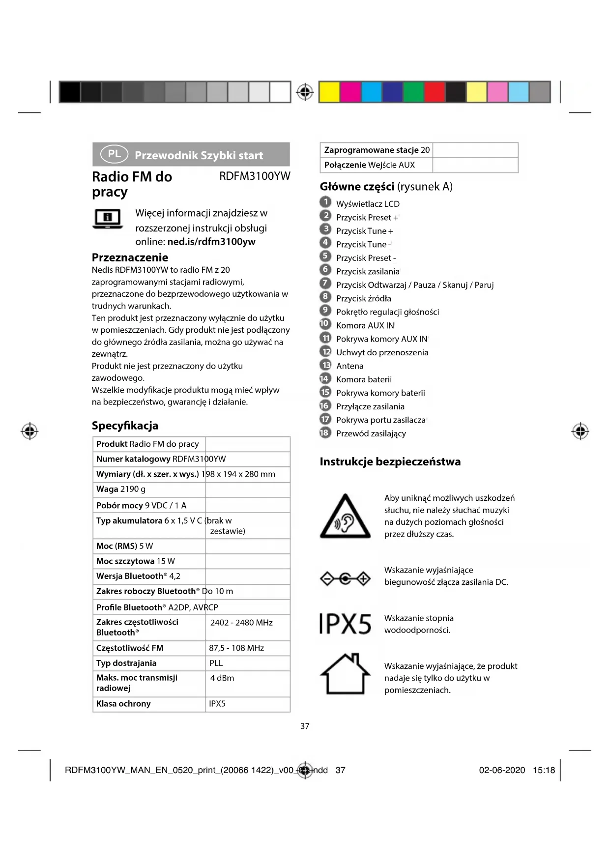 Przewodnik Szybki start Radio FM do pracy RDFM3100YW Więcej informacji znajdziesz w rozszerzonej instrukcji obsługi online: ned.is/rdfm3100yw Przeznaczenie Nedis RDFM3100YW to radio FM z 20 zaprogramowanymi stacjami radiowymi, przeznaczone do bezprzewodowego użytkowania w trudnych warunkach. Ten produkt jest przeznaczony wyłącznie do użytku w pomieszczeniach. Gdy produkt nie jest podłączony do głównego źródła zasilania, można go używać na zewnątrz. Produkt nie jest przeznaczony do użytku zawodowego. Wszelkie modykacje produktu mogą mieć wpływ na bezpieczeństwo, gwarancję i działanie. Specykacja Produkt Radio FM do pracy Numer katalogowy RDFM3100YW Wymiary (dł. x szer. x wys.) 198 x 194 x 280 mm Waga 2190 g Pobór mocy 9 VDC / 1 A Typ akumulatora 6 x 1,5 V C (brak w zestawie) Moc (RMS) 5 W Moc szczytowa 15 W Wersja Bluetooth® 4,2 Zakres roboczy Bluetooth® Do 10 m Prole Bluetooth® A2DP, AVRCP Zakres częstotliwości Bluetooth® 2402 - 2480 MHz Częstotliwość FM 87,5 - 108 MHz Typ dostrajania PLL Maks. moc transmisji radiowej 4 dBm Klasa ochrony IPX5 RDFM3100YW_MAN_EN_0520_print_(20066 1422)_v00_03.indd 37RDFM3100YW_MAN_EN_0520_print_(20066 1422)_v00_03.indd 37 02-06-2020 15:1802-06-2020 15:1838 nadmiernym kurzem i brudem.