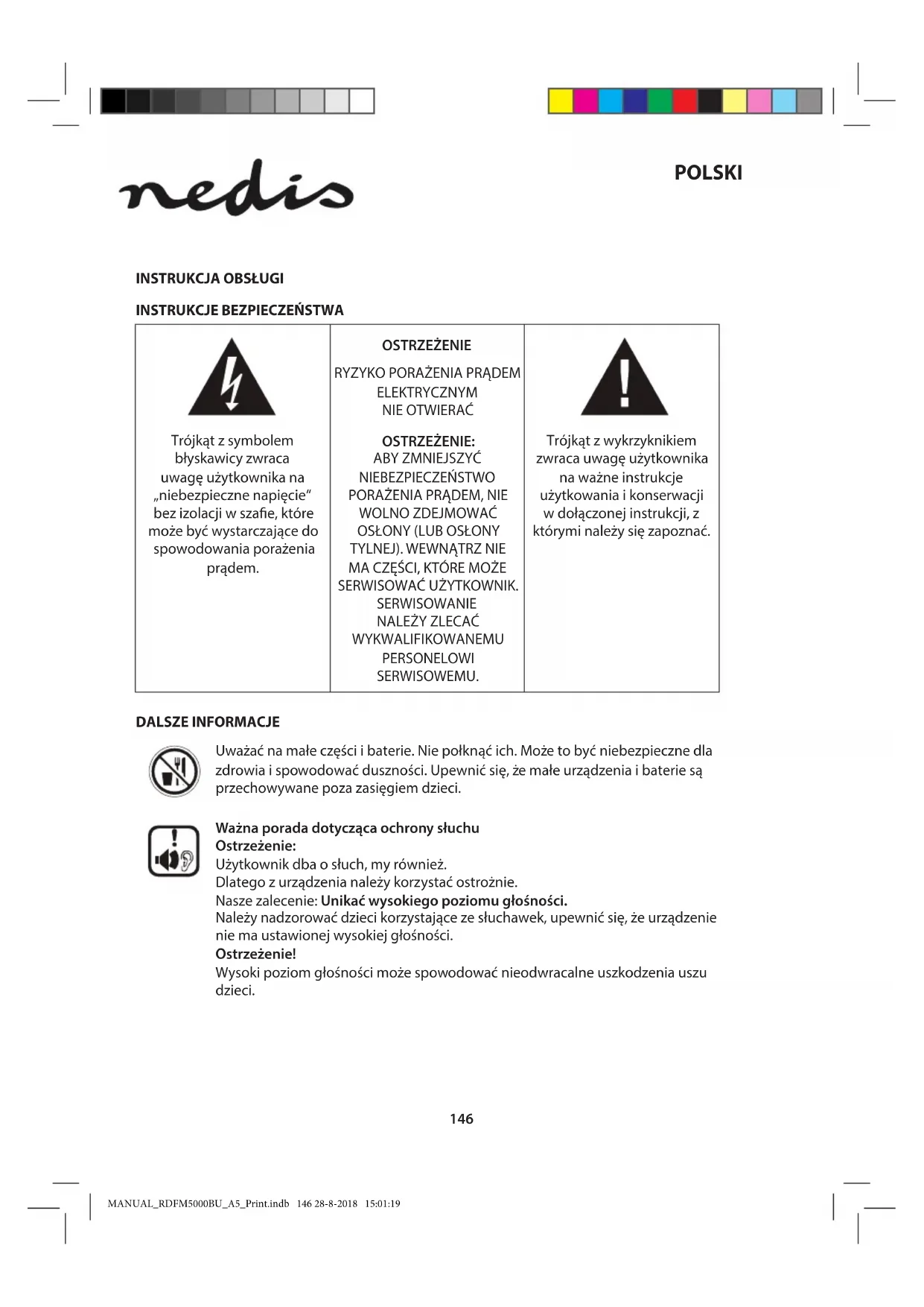 NIE OTWIERAĆ Wskazówki dotyczące bezpieczeństwa: Aby zmniejszyć ryzyko porażenia prądem elektrycznym, produkt ten mogą otwierać WYŁĄCZNIE upoważnieni technicy, gdy konieczne jest przeprowadzenie prac serwisowych. W przypadku napotkania problemu należy odłączyć produkt od zasilania oraz od innych urządzeń. Nie wystawiać produktu na działanie wody i wilgoci. Konserwacja: Czyścić wyłącznie suchą szmatką. Nie stosować płynów do czyszczenia ani środków ściernych. Gwarancja: Producent nie udziela żadnych gwarancji ani nie ponosi odpowiedzialności za żadne zmiany i modykacje produktu ani za uszkodzenia spowodowane nieprawidłowym użyciem niniejszego produktu. Informacje ogólne: Wszystkie projekty i specykacje mogą zostać zmienione bez uprzedniego powiadomienia. Wszystkie loga oraz nazwy marek i produktów są znakami towarowymi lub zastrzeżonymi znakami towarowymi ich właścicieli i niniejszym są za takie uznawane. Niniejszą instrukcję oraz opakowanie należy zachować celem wykorzystania w przyszłości. Uwaga: Produkt ten jest oznaczony następującym symbolem. Oznacza to, że zużytego sprzętu elektrycznego i elektronicznego nie można mieszać z innymi odpadami domowymi. Istnieje oddzielny system zbierania takich produktów. Produkt ten został wyprodukowany i dostarczony zgodnie z przepisami i dyrektywami obowiązującymi we wszystkich państwach członkowskich Unii Europejskiej. Produkt jest również zgodny ze wszystkimi obowiązującymi specykacjami i przepisami krajów, w których jest sprzedawany. Ocjalna dokumentacja dostępna jest na żądanie. Dokumentacja ta obejmuje, ale nie ogranicza się do: Deklaracji zgodności (i tożsamości produktu), Karty charakterystyki substancji niebezpiecznej oraz raportu z testów produktu. Prosimy o kontakt z naszym działem obsługi klienta w celu uzyskania pomocy: na stronie internetowej: http://www.nedis.com/en-us/contact/contact-form.htm wysyłając wiadomość e-mail: service@nedis.com telefonicznie: +31 (0)73-5993965 (w godzinach pracy biura) NEDIS B.V., De Tweeling 28, 5215 MC ’s-Hertogenbosch, HOLANDIA MANUAL_RDFM5000BU_A5_Print.indb 154 28-8-2018 15:01:20