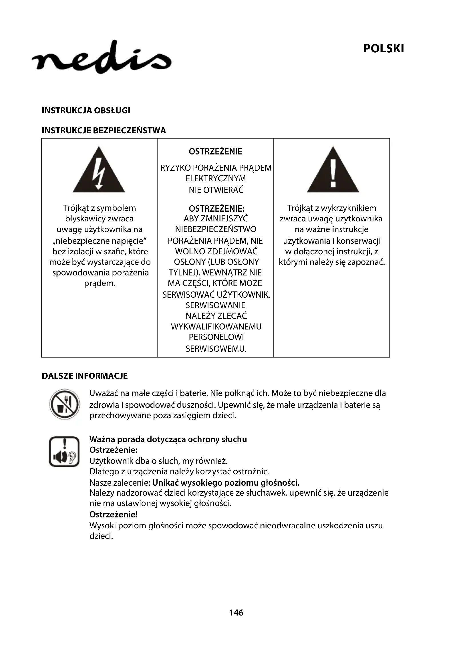 NIE OTWIERAĆ Wskazówki dotyczące bezpieczeństwa: Aby zmniejszyć ryzyko porażenia prądem elektrycznym, produkt ten mogą otwierać WYŁĄCZNIE upoważnieni technicy, gdy konieczne jest przeprowadzenie prac serwisowych. W przypadku napotkania problemu należy odłączyć produkt od zasilania oraz od innych urządzeń. Nie wystawiać produktu na działanie wody i wilgoci. Konserwacja: Czyścić wyłącznie suchą szmatką. Nie stosować płynów do czyszczenia ani środków ściernych. Gwarancja: Producent nie udziela żadnych gwarancji ani nie ponosi odpowiedzialności za żadne zmiany i modykacje produktu ani za uszkodzenia spowodowane nieprawidłowym użyciem niniejszego produktu. Informacje ogólne: Wszystkie projekty i specykacje mogą zostać zmienione bez uprzedniego powiadomienia. Wszystkie loga oraz nazwy marek i produktów są znakami towarowymi lub zastrzeżonymi znakami towarowymi ich właścicieli i niniejszym są za takie uznawane. Niniejszą instrukcję oraz opakowanie należy zachować celem wykorzystania w przyszłości. Uwaga: Produkt ten jest oznaczony następującym symbolem. Oznacza to, że zużytego sprzętu elektrycznego i elektronicznego nie można mieszać z innymi odpadami domowymi. Istnieje oddzielny system zbierania takich produktów. Produkt ten został wyprodukowany i dostarczony zgodnie z przepisami i dyrektywami obowiązującymi we wszystkich państwach członkowskich Unii Europejskiej. Produkt jest również zgodny ze wszystkimi obowiązującymi specykacjami i przepisami krajów, w których jest sprzedawany. Ocjalna dokumentacja dostępna jest na żądanie. Dokumentacja ta obejmuje, ale nie ogranicza się do: Deklaracji zgodności (i tożsamości produktu), Karty charakterystyki substancji niebezpiecznej oraz raportu z testów produktu. Prosimy o kontakt z naszym działem obsługi klienta w celu uzyskania pomocy: na stronie internetowej: http://www.nedis.com/en-us/contact/contact-form.htm wysyłając wiadomość e-mail: service@nedis.com telefonicznie: +31 (0)73-5993965 (w godzinach pracy biura) NEDIS B.V., De Tweeling 28, 5215 MC ’s-Hertogenbosch, HOLANDIA