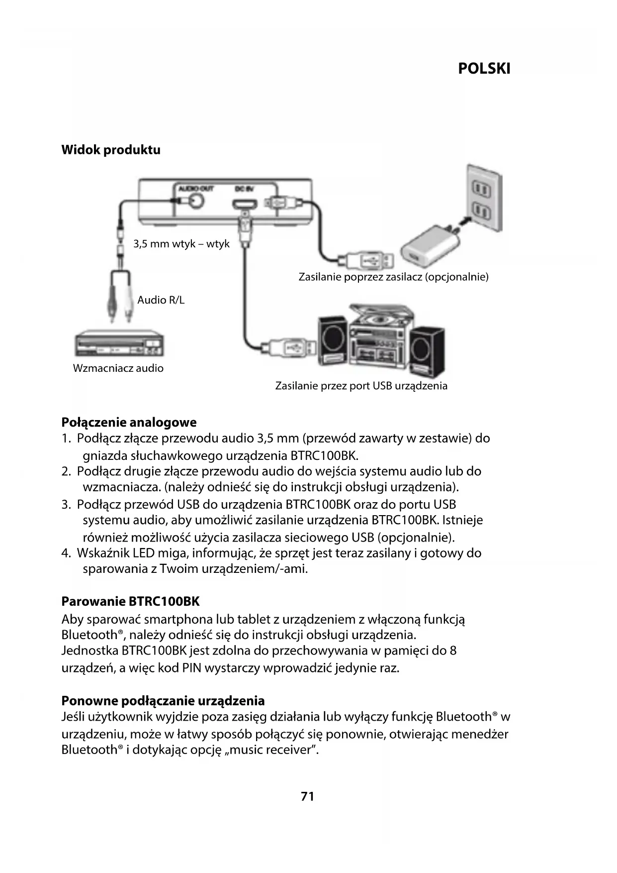 systemu audio, aby umożliwić zasilanie urządzenia BTRC100BK. Istnieje również możliwość użycia zasilacza sieciowego USB (opcjonalnie).