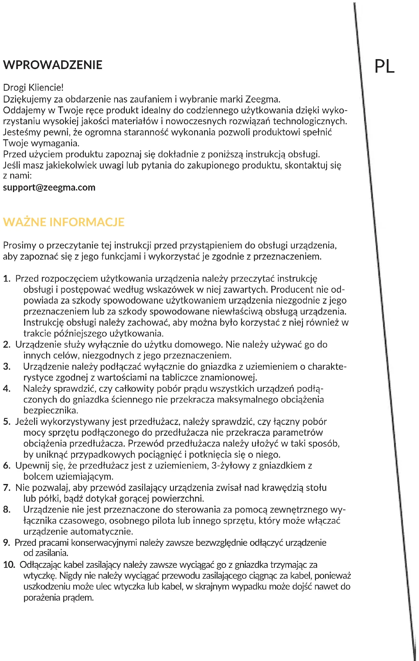 Die Fotos sind anschaulich, das tatsächliche Aussehen der Produkte kann von der gezeigten Abbildung abweichen.PL WPROWADZENIE Drogi Kliencie! Dziękujemy za obdarzenie nas zaufaniem i wybranie marki Zeegma. Oddajemy w Twoje ręce produkt idealny do codziennego użytkowania dzięki wyko- rzystaniu wysokiej jakości materiałów i nowoczesnych rozwiązań technologicznych. Jesteśmy pewni, że ogromna staranność wykonania pozwoli produktowi spełnić Twoje wymagania. Przed użyciem produktu zapoznaj się dokładnie z poniższą instrukcją obsługi. Jeśli masz jakiekolwiek uwagi lub pytania do zakupionego produktu, skontaktuj się z nami: support@zeegma.com