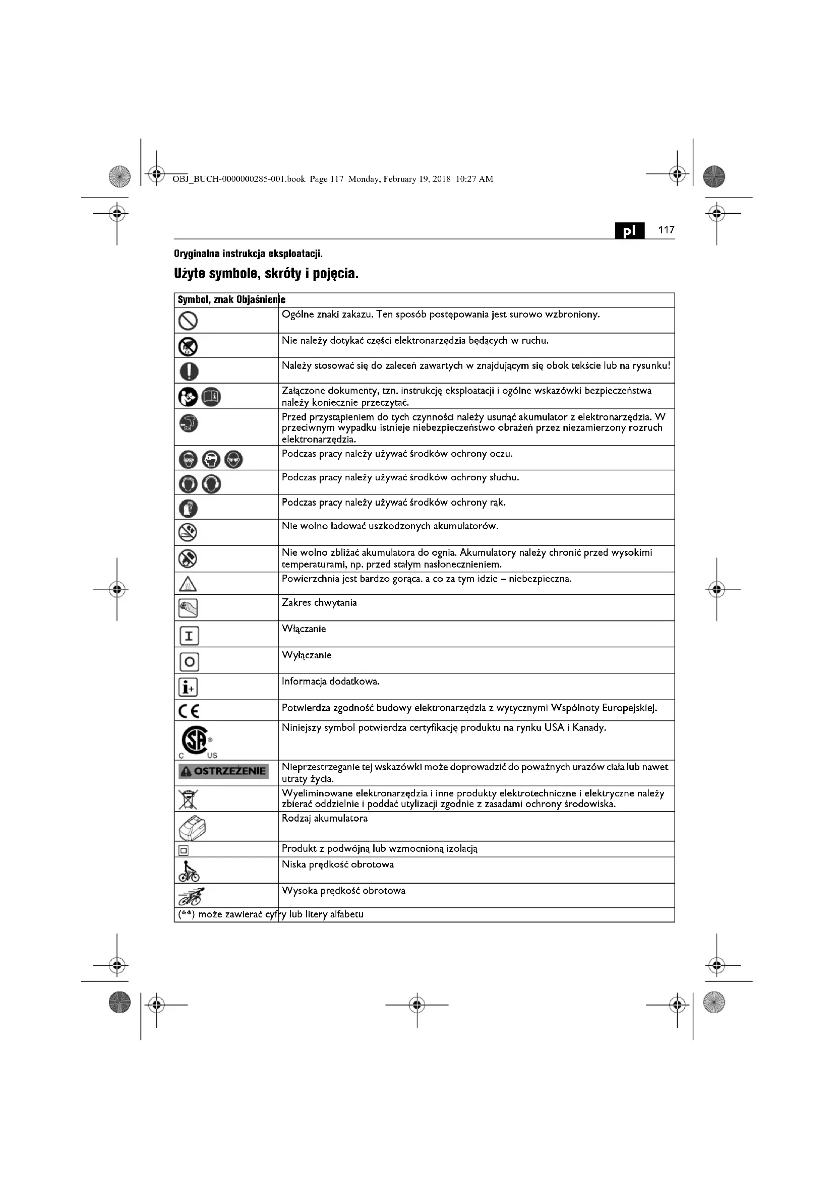 Oryginalna instrukcja eksploatacji. Użyte symbole, skróty i pojęcia. Symbol, znak Objaśnienie Ogólne znaki zakazu. Ten sposób postępowania jest surowo wzbroniony. Nie należy dotykać części elektronarzędzia będących w ruchu. Należy stosować się do zaleceń zawartych w znajdującym się obok tekście lub na rysunku! Załączone dokumenty, tzn. instrukcję eksploatacji i ogólne wskazówki bezpieczeństwa należy koniecznie przeczytać. Przed przystąpieniem do tych czynności należy usunąć akumulator z elektronarzędzia. W przeciwnym wypadku istnieje niebezpieczeństwo obrażeń przez niezamierzony rozruch elektronarzędzia. Podczas pracy należy używać środków ochrony oczu. Podczas pracy należy używać środków ochrony słuchu. Podczas pracy należy używać środków ochrony rąk. Nie wolno ładować uszkodzonych akumulatorów. Nie wolno zbliżać akumulatora do ognia. Akumulatory należy chronić przed wysokimi temperaturami, np. przed stałym nasłonecznieniem. Powierzchnia jest bardzo gorąca. a co za tym idzie – niebezpieczna. Zakres chwytania Włączanie Wyłączanie Informacja dodatkowa. Potwierdza zgodność budowy elektronarzędzia z wytycznymi Wspólnoty Europejskiej. Niniejszy symbol potwierdza certyfikację produktu na rynku USA i Kanady. Nieprzestrzeganie tej wskazówki może doprowadzić do poważnych urazów ciała lub nawet utraty życia. Wyeliminowane elektronarzędzia i inne produkty elektrotechniczne i elektryczne należy zbierać oddzielnie i poddać utylizacji zgodnie z zasadami ochrony środowiska. Rodzaj akumulatora Produkt z podwójną lub wzmocnioną izolacją Niska prędkość obrotowa Wysoka prędkość obrotowa (**) może zawierać cyfry lub litery alfabetu OBJ_BUCH-0000000285-001.book Page 117 Monday, February 19, 2018 10:27 AM118
