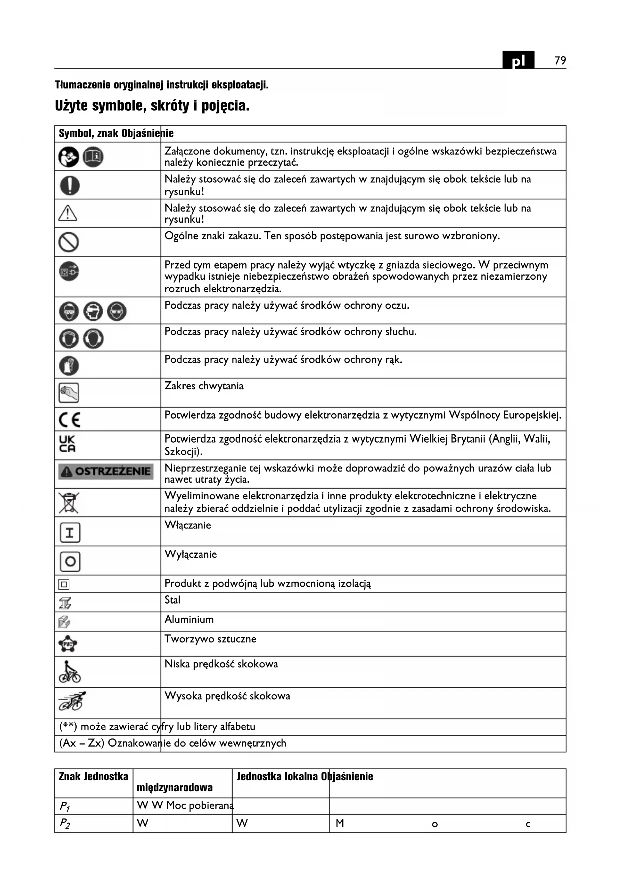Tłumaczenie oryginalnej instrukcji eksploatacji. Użyte symbole, skróty i pojęcia. Symbol, znak Objaśnienie Załączone dokumenty, tzn. instrukcję eksploatacji i ogólne wskazówki bezpieczeństwa należy koniecznie przeczytać. Należy stosować się do zaleceń zawartych w znajdującym się obok tekście lub na rysunku! Należy stosować się do zaleceń zawartych w znajdującym się obok tekście lub na rysunku! Ogólne znaki zakazu. Ten sposób postępowania jest surowo wzbroniony. Przed tym etapem pracy należy wyjąć wtyczkę z gniazda sieciowego. W przeciwnym wypadku istnieje niebezpieczeństwo obrażeń spowodowanych przez niezamierzony rozruch elektronarzędzia. Podczas pracy należy używać środków ochrony oczu. Podczas pracy należy używać środków ochrony słuchu. Podczas pracy należy używać środków ochrony rąk. Zakres chwytania Potwierdza zgodność budowy elektronarzędzia z wytycznymi Wspólnoty Europejskiej. Potwierdza zgodność elektronarzędzia z wytycznymi Wielkiej Brytanii (Anglii, Walii, Szkocji). Nieprzestrzeganie tej wskazówki może doprowadzić do poważnych urazów ciała lub nawet utraty życia. Wyeliminowane elektronarzędzia i inne produkty elektrotechniczne i elektryczne należy zbierać oddzielnie i poddać utylizacji zgodnie z zasadami ochrony środowiska. Włączanie Wyłączanie Produkt z podwójną lub wzmocnioną izolacją Stal Aluminium Tworzywo sztuczne Niska prędkość skokowa Wysoka prędkość skokowa (**) może zawierać cyfry lub litery alfabetu (Ax – Zx) Oznakowanie do celów wewnętrznych Znak Jednostka międzynarodowa Jednostka lokalna Objaśnienie