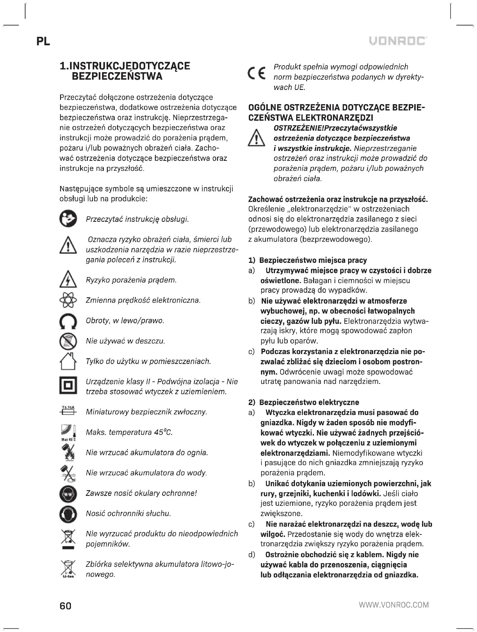 Przed rozpoczęciem czyszczenia i konser- wacji zawsze wyłączać urządzenie i wyjmować z niego akumulator. Czyścić obudowę urządzenia regularnie miękką ściereczką, najlepiej po każdym użyciu. Dopilnować, aby otwory wentylacyjne były wolne od pyłu, kurzu i zabrudzeń. Usuwać oporne zabrudzenia miękką ściereczką zwilżoną mydlinami. Nie używać żadnych rozpuszczalników, takich jak benzyna, alkohol, amo- niak itp. Takie substancje chemiczne spowodują uszkodzenie części z tworzyw sztucznych. OCHRONA ŚRODOWISKA Uszkodzone i/lub niepotrzebne urządzenia elektryczne lub elektroniczne podlegają zbiórce w odpowiednich punktach recyklingu. Tylko kraje WE Nie wyrzucać elektronarzędzi wraz z odpadami z gospodarstw domowych. Zgodnie z dyrektywą 2012/19/WE dotyczącą zużytych urządzeń elektrycz- nych i elektronicznych oraz jej wdrożeniem do prawo- dawstwa krajowego, elektronarzędzia, które już nie nadają się do użytku, podlegają oddzielnej zbiórce oraz utylizacji w sposób przyjazny dla środowiska. GWARANCJA Produkty VONROC są wytwarzane zgodnie z najwyż- szymi standardami jakości i producent udziela gwarancji na wady materiałowe i wady wykonania na okres wymagany prawem, licząc od dnia zaku- pu. Jeśli wystąpi usterka produktu w tym okresie spowodowana wadą materiałową i/lub wadą wykonania, proszę bezpośrednio skontaktować się ze sprzedawcą VONROC. Następujące okoliczności powodują unieważnienie gwarancji: