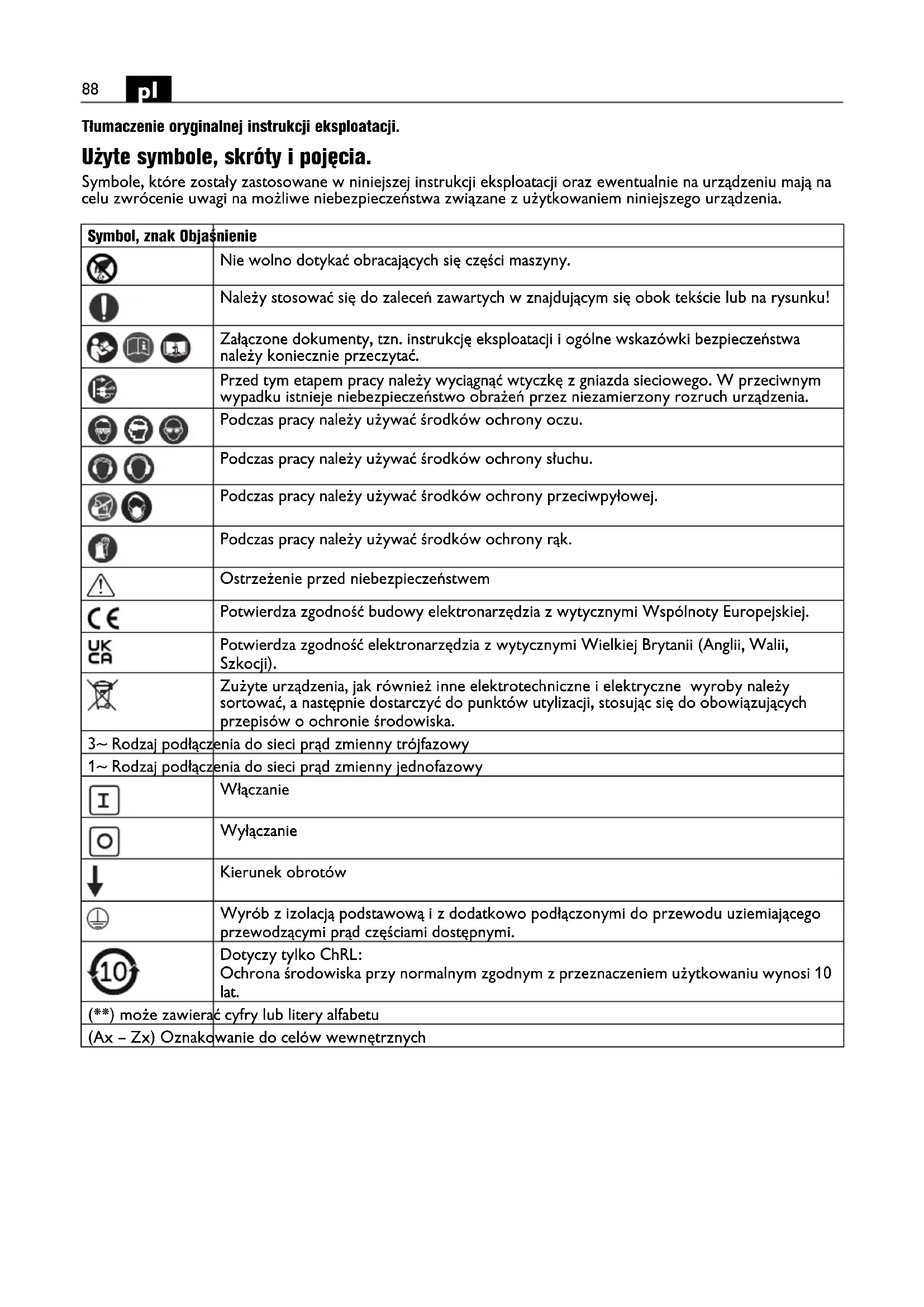 Tłumaczenie oryginalnej instrukcji eksploatacji. Użyte symbole, skróty i pojęcia. Symbole, które zostały zastosowane w niniejszej instrukcji eksploatacji oraz ewentualnie na urządzeniu mają na celu zwrócenie uwagi na możliwe niebezpieczeństwa związane z użytkowaniem niniejszego urządzenia. Symbol, znak Objaśnienie Nie wolno dotykać obracających się części maszyny. Należy stosować się do zaleceń zawartych w znajdującym się obok tekście lub na rysunku! Załączone dokumenty, tzn. instrukcję eksploatacji i ogólne wskazówki bezpieczeństwa należy koniecznie przeczytać. Przed tym etapem pracy należy wyciągnąć wtyczkę z gniazda sieciowego. W przeciwnym wypadku istnieje niebezpieczeństwo obrażeń przez niezamierzony rozruch urządzenia. Podczas pracy należy używać środków ochrony oczu. Podczas pracy należy używać środków ochrony słuchu. Podczas pracy należy używać środków ochrony przeciwpyłowej. Podczas pracy należy używać środków ochrony rąk. Ostrzeżenie przed niebezpieczeństwem Potwierdza zgodność budowy elektronarzędzia z wytycznymi Wspólnoty Europejskiej. Potwierdza zgodność elektronarzędzia z wytycznymi Wielkiej Brytanii (Anglii, Walii, Szkocji). Zużyte urządzenia, jak również inne elektrotechniczne i elektryczne wyroby należy sortować, a następnie dostarczyć do punktów utylizacji, stosując się do obowiązujących przepisów o ochronie środowiska. 3~ Rodzaj podłączenia do sieci prąd zmienny trójfazowy 1~ Rodzaj podłączenia do sieci prąd zmienny jednofazowy Włączanie Wyłączanie Kierunek obrotów Wyrób z izolacją podstawową i z dodatkowo podłączonymi do przewodu uziemiającego przewodzącymi prąd częściami dostępnymi. Dotyczy tylko ChRL: Ochrona środowiska przy normalnym zgodnym z przeznaczeniem użytkowaniu wynosi 10 lat. (**) może zawierać cyfry lub litery alfabetu (Ax – Zx) Oznakowanie do celów wewnętrznych89
