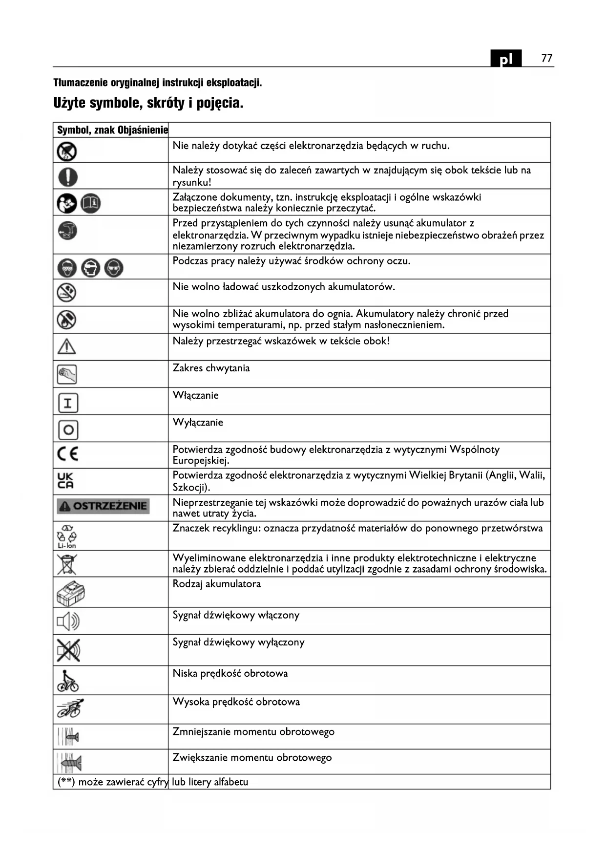 Tłumaczenie oryginalnej instrukcji eksploatacji. Użyte symbole, skróty i pojęcia. Symbol, znak Objaśnienie Nie należy dotykać części elektronarzędzia będących w ruchu. Należy stosować się do zaleceń zawartych w znajdującym się obok tekście lub na rysunku! Załączone dokumenty, tzn. instrukcję eksploatacji i ogólne wskazówki bezpieczeństwa należy koniecznie przeczytać. Przed przystąpieniem do tych czynności należy usunąć akumulator z elektronarzędzia. W przeciwnym wypadku istnieje niebezpieczeństwo obrażeń przez niezamierzony rozruch elektronarzędzia. Podczas pracy należy używać środków ochrony oczu. Nie wolno ładować uszkodzonych akumulatorów. Nie wolno zbliżać akumulatora do ognia. Akumulatory należy chronić przed wysokimi temperaturami, np. przed stałym nasłonecznieniem. Należy przestrzegać wskazówek w tekście obok! Zakres chwytania Włączanie Wyłączanie Potwierdza zgodność budowy elektronarzędzia z wytycznymi Wspólnoty Europejskiej. Potwierdza zgodność elektronarzędzia z wytycznymi Wielkiej Brytanii (Anglii, Walii, Szkocji). Nieprzestrzeganie tej wskazówki może doprowadzić do poważnych urazów ciała lub nawet utraty życia. Znaczek recyklingu: oznacza przydatność materiałów do ponownego przetwórstwa Wyeliminowane elektronarzędzia i inne produkty elektrotechniczne i elektryczne należy zbierać oddzielnie i poddać utylizacji zgodnie z zasadami ochrony środowiska. Rodzaj akumulatora Sygnał dźwiękowy włączony Sygnał dźwiękowy wyłączony Niska prędkość obrotowa Wysoka prędkość obrotowa Zmniejszanie momentu obrotowego Zwiększanie momentu obrotowego (**) może zawierać cyfry lub litery alfabetu78