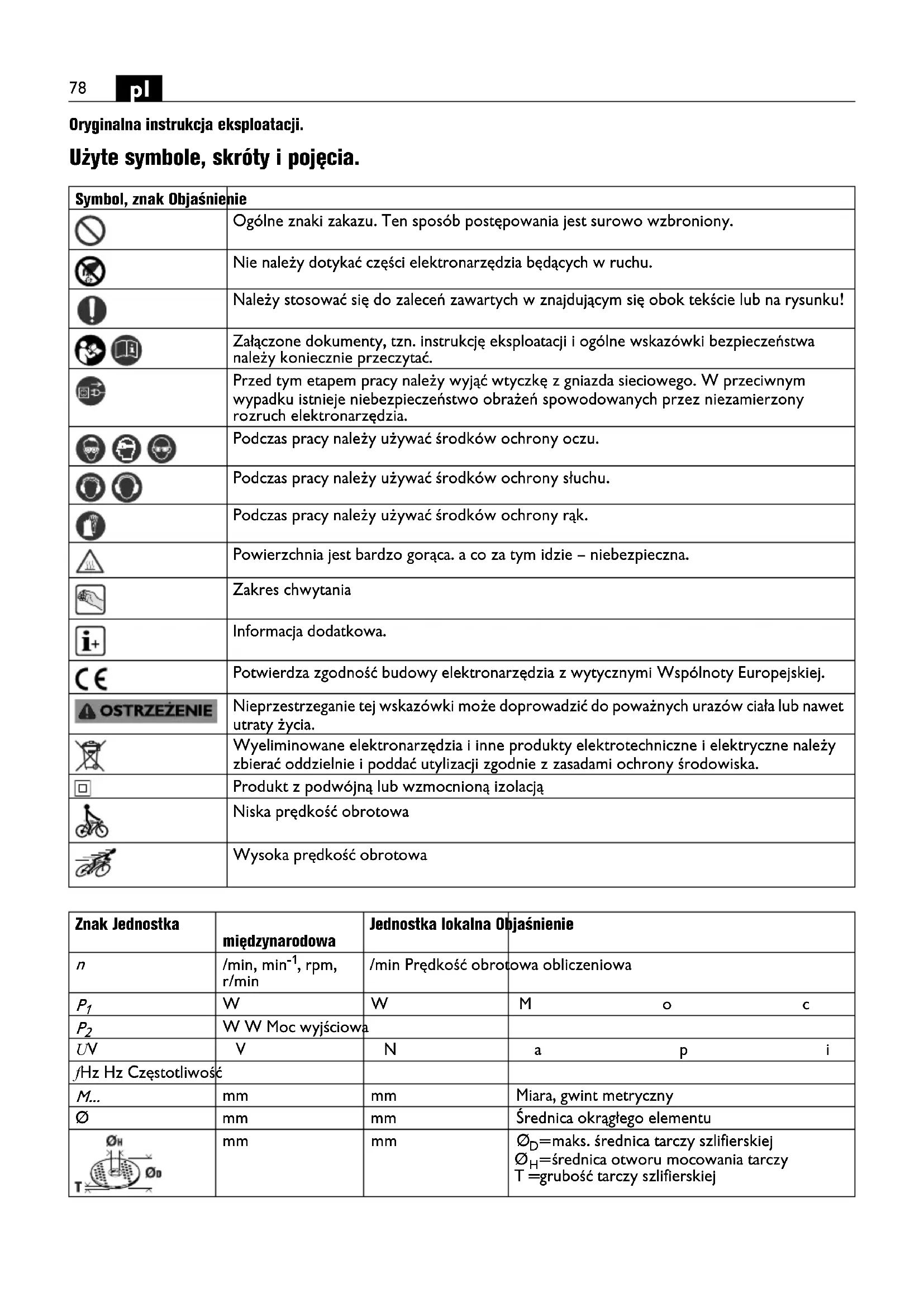 Oryginalna instrukcja eksploatacji. Użyte symbole, skróty i pojęcia. Symbol, znak Objaśnienie Ogólne znaki zakazu. Ten sposób postępowania jest surowo wzbroniony. Nie należy dotykać części elektronarzędzia będących w ruchu. Należy stosować się do zaleceń zawartych w znajdującym się obok tekście lub na rysunku! Załączone dokumenty, tzn. instrukcję eksploatacji i ogólne wskazówki bezpieczeństwa należy koniecznie przeczytać. Przed tym etapem pracy należy wyjąć wtyczkę z gniazda sieciowego. W przeciwnym wypadku istnieje niebezpieczeństwo obrażeń spowodowanych przez niezamierzony rozruch elektronarzędzia. Podczas pracy należy używać środków ochrony oczu. Podczas pracy należy używać środków ochrony słuchu. Podczas pracy należy używać środków ochrony rąk. Powierzchnia jest bardzo gorąca. a co za tym idzie – niebezpieczna. Zakres chwytania Informacja dodatkowa. Potwierdza zgodność budowy elektronarzędzia z wytycznymi Wspólnoty Europejskiej. Nieprzestrzeganie tej wskazówki może doprowadzić do poważnych urazów ciała lub nawet utraty życia. Wyeliminowane elektronarzędzia i inne produkty elektrotechniczne i elektryczne należy zbierać oddzielnie i poddać utylizacji zgodnie z zasadami ochrony środowiska. Produkt z podwójną lub wzmocnioną izolacją Niska prędkość obrotowa Wysoka prędkość obrotowa Znak Jednostka międzynarodowa Jednostka lokalna Objaśnienie