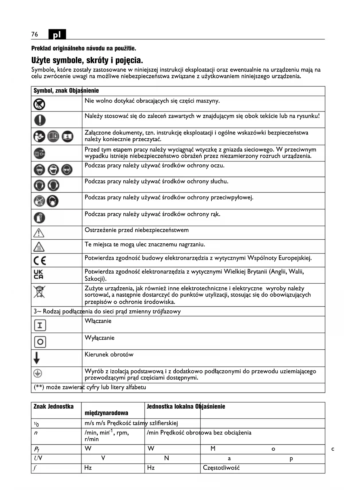 Preklad originálneho návodu na použitie. Użyte symbole, skróty i pojęcia. Symbole, które zostały zastosowane w niniejszej instrukcji eksploatacji oraz ewentualnie na urządzeniu mają na celu zwrócenie uwagi na możliwe niebezpieczeństwa związane z użytkowaniem niniejszego urządzenia. Symbol, znak Objaśnienie Nie wolno dotykać obracających się części maszyny. Należy stosować się do zaleceń zawartych w znajdującym się obok tekście lub na rysunku! Załączone dokumenty, tzn. instrukcję eksploatacji i ogólne wskazówki bezpieczeństwa należy koniecznie przeczytać. Przed tym etapem pracy należy wyciągnąć wtyczkę z gniazda sieciowego. W przeciwnym wypadku istnieje niebezpieczeństwo obrażeń przez niezamierzony rozruch urządzenia. Podczas pracy należy używać środków ochrony oczu. Podczas pracy należy używać środków ochrony słuchu. Podczas pracy należy używać środków ochrony przeciwpyłowej. Podczas pracy należy używać środków ochrony rąk. Ostrzeżenie przed niebezpieczeństwem Te miejsca te mogą ulec znacznemu nagrzaniu. Potwierdza zgodność budowy elektronarzędzia z wytycznymi Wspólnoty Europejskiej. Potwierdza zgodność elektronarzędzia z wytycznymi Wielkiej Brytanii (Anglii, Walii, Szkocji). Zużyte urządzenia, jak również inne elektrotechniczne i elektryczne wyroby należy sortować, a następnie dostarczyć do punktów utylizacji, stosując się do obowiązujących przepisów o ochronie środowiska. 3~ Rodzaj podłączenia do sieci prąd zmienny trójfazowy Włączanie Wyłączanie Kierunek obrotów Wyrób z izolacją podstawową i z dodatkowo podłączonymi do przewodu uziemiającego przewodzącymi prąd częściami dostępnymi. (**) może zawierać cyfry lub litery alfabetu Znak Jednostka międzynarodowa Jednostka lokalna Objaśnienie