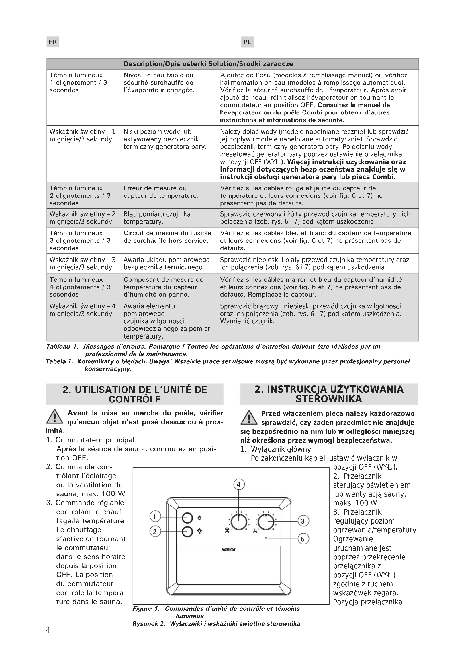 - Messages d’erreurs (tableau 1) reguluje poziom temperatury w saunie. W celu wyłączenia ogrzewania należy ustawić przełącznik z powrotem w pozycji OFF (WYŁ.). Uwaga! Ustawiona wartość wilgotności określi maksymalną temperaturę panującą w saunie bez względu na pozycję przełącznika temperatury.