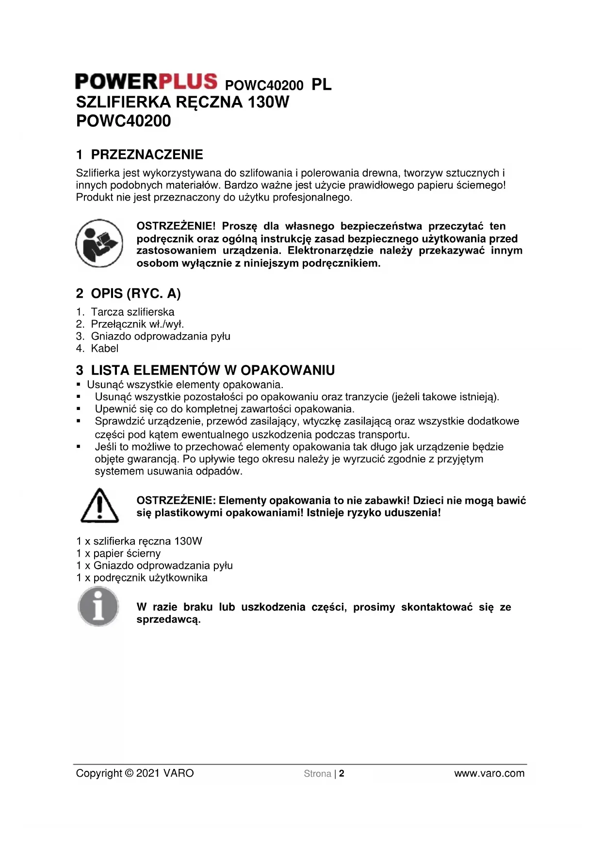 Szilifierka jest wykorystwywna do szlifowania i polerowania drewna, tworzyw sztucznych i innych podobnych materiałow. Bardzo zań jest uzycie prawidłowej papieru scierngo! Produkt nie jest przyznaczony do uzytku profesjonalneo.
