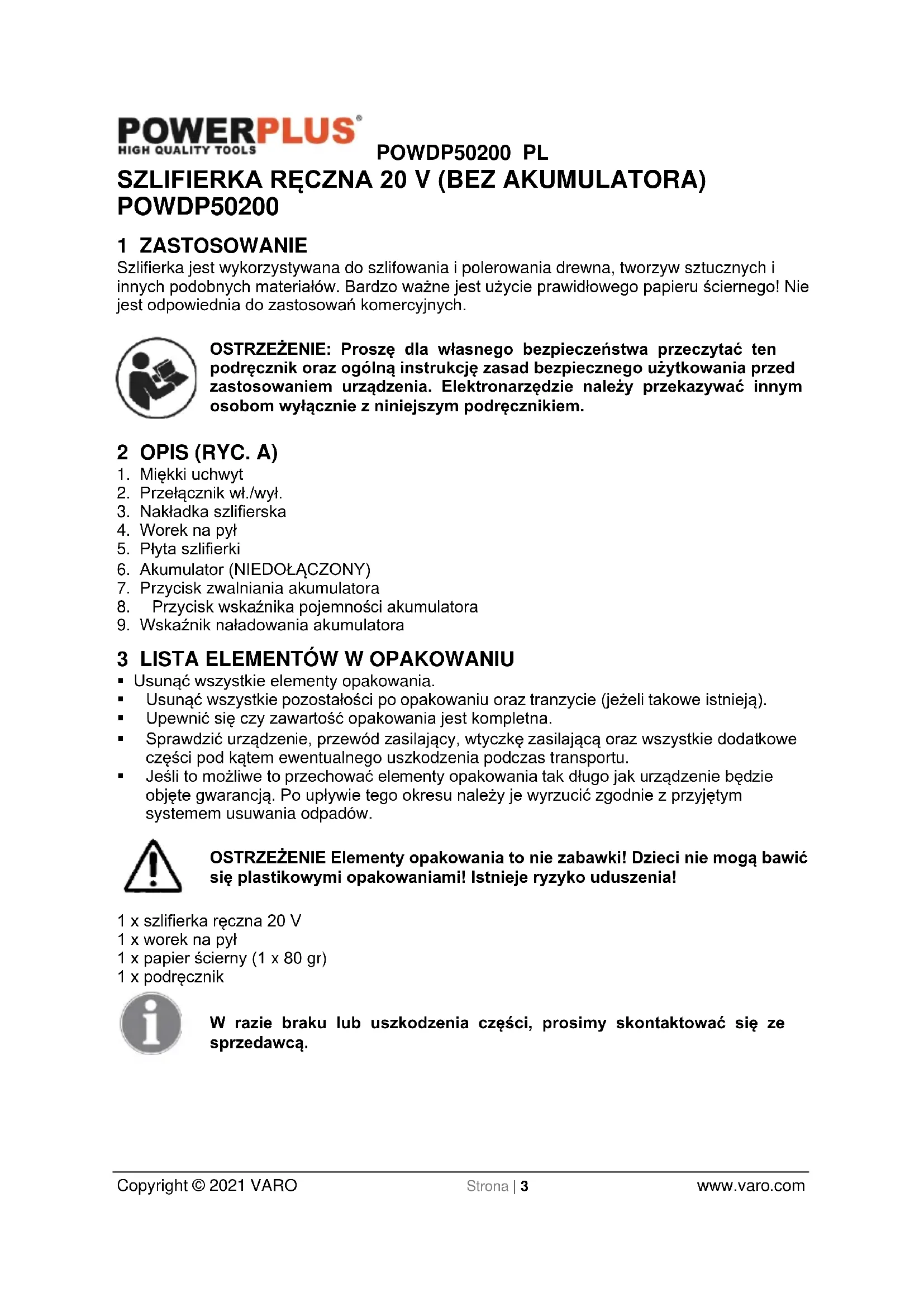 OSTRZEZENIE: Prosę dla wąsnogo bezpieczność mistręczytać ten podręcznik oraz odólny instrukcy zasad bezpiecznych uzytkowania przy zastososOWANIUM urzadzenia. Elektronarżędzie sąȩ przy przekazywać innym osobom wymiarcznie z niniejszym podręcznikiem.