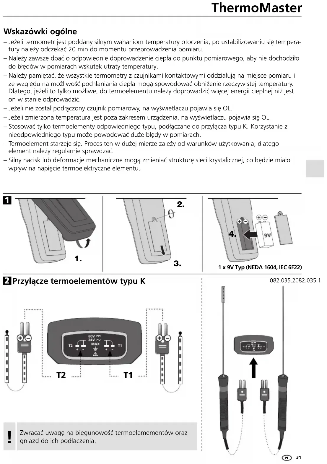 – Jeżeli termometr jest poddany silnym wahaniom temperatury otoczenia, po ustabilizowaniu się tempera- tury należy odczekać 20 min do momentu przeprowadzenia pomiaru. – Należy zawsze dbać o odpowiednie doprowadzenie ciepła do punktu pomiarowego, aby nie dochodziło do błędów w pomiarach wskutek utraty temperatury. – Należy pamiętać, że wszystkie termometry z czujnikami kontaktowymi oddziałują na miejsce pomiaru i ze względu na możliwość pochłaniania ciepła mogą spowodować obniżenie rzeczywistej temperatury. Dlatego, jeżeli to tylko możliwe, do termoelementu należy doprowadzić więcej energii cieplnej niż jest on w stanie odprowadzić. – Jeżeli nie został podłączony czujnik pomiarowy, na wyświetlaczu pojawia się OL. – Jeżeli zmierzona temperatura jest poza zakresem urządzenia, na wyświetlaczu pojawia się OL. – Stosować tylko termoelementy odpowiedniego typu, podłączane do przyłącza typu K. Korzystanie z nieodpowiedniego typu moż e powodować duże błędy w pomiarach. – Termoelement starzeje się. Proces ten w dużej mierze zależy od warunków użytkowania, dlatego element należy regularnie sprawdzać. – Silny nacisk lub deformacje mechaniczne mogą zmieniać strukturę sieci krystalicznej, co będzie miało wpływ na napięcie termoelektryczne elementu. Wskazówki ogólne