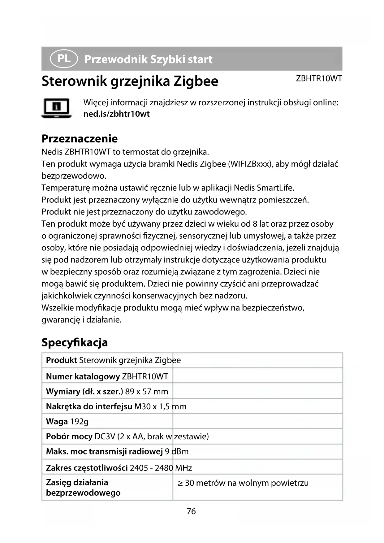Przewodnik Szybki start Sterownik grzejnika Zigbee ZBHTR10WT Więcej informacji znajdziesz w rozszerzonej instrukcji obsługi online: ned.is/zbhtr10wt Przeznaczenie Nedis ZBHTR10WT to termostat do grzejnika. Ten produkt wymaga użycia bramki Nedis Zigbee (WIFIZBxxx), aby mógł działać bezprzewodowo. Temperaturę można ustawić ręcznie lub w aplikacji Nedis SmartLife. Produkt jest przeznaczony wyłącznie do użytku wewnątrz pomieszczeń. Produkt nie jest przeznaczony do użytku zawodowego. Ten produkt może być używany przez dzieci w wieku od 8 lat oraz przez osoby o ograniczonej sprawności zycznej, sensorycznej lub umysłowej, a także przez osoby, które nie posiadają odpowiedniej wiedzy i doświadczenia, jeżeli znajdują się pod nadzorem lub otrzymały instrukcje dotyczące użytkowania produktu w bezpieczny sposób oraz rozumieją związane z tym zagrożenia. Dzieci nie mogą bawić się produktem. Dzieci nie powinny czyścić ani przeprowadzać jakichkolwiek czynności konserwacyjnych bez nadzoru. Wszelkie modykacje produktu mogą mieć wpływ na bezpieczeństwo, gwarancję i działanie. Specykacja Produkt Sterownik grzejnika Zigbee Numer katalogowy ZBHTR10WT Wymiary (dł. x szer.) 89 x 57 mm Nakrętka do interfejsu M30 x 1,5 mm Waga 192g Pobór mocy DC3V (2 x AA, brak w zestawie) Maks. moc transmisji radiowej 9 dBm Zakres częstotliwości 2405 - 2480 MHz Zasięg działania bezprzewodowego ≥ 30 metrów na wolnym powietrzu77 Zakres ustawień temperatury Tryb automatyczny Tryb ręczny Tryb przeciwzamrożeniowy 5 °C ~ 30 °C 5 °C ~ 30 °C 5 °C ~ 15 °C Temperatura pomiaru 0 °C ~ 50 °C Interwały pomiarów 2 minut Skok zaworu Maks. 6 mm Poziom hałasu < 35 dBa Temperatura otoczenia -20 °C ~ 65 °C Temperatura przechowywania 0 °C ~ 40 °C Maks. temperatura wody 90 °C Normy środowiskowe RoHS Główne części (rysunek A) 1 Nakrętka pierścieniowa 2 Korpus 3 Pokrętło termostatu 4 Wyświetlacz LCD 5 Usterka 6 Niski stopień naładowania baterii 7 Ustawiona temperatura 8 Wykrywanie okna 9 Tryb automatyczny q Blokada rodzicielska w Wskaźnik sieci e Tryb instalacyjny r Tryb ręczny Omówienie aplikacji(obraz B) 1 Stan baterii 2 Ustawiona temperatura 3 Temperatura pokojowa 4 Tryb ręczny 5 Tryb automatyczny 6 Zabezpieczenie przed dziećmi 7 Wykrywanie zaworu 8 Pokrętło regulacji temperatury 9 Zakres temperatur q Tryb przeciwzamrożeniowy w Wykrywanie okna Instrukcje bezpieczeństwa