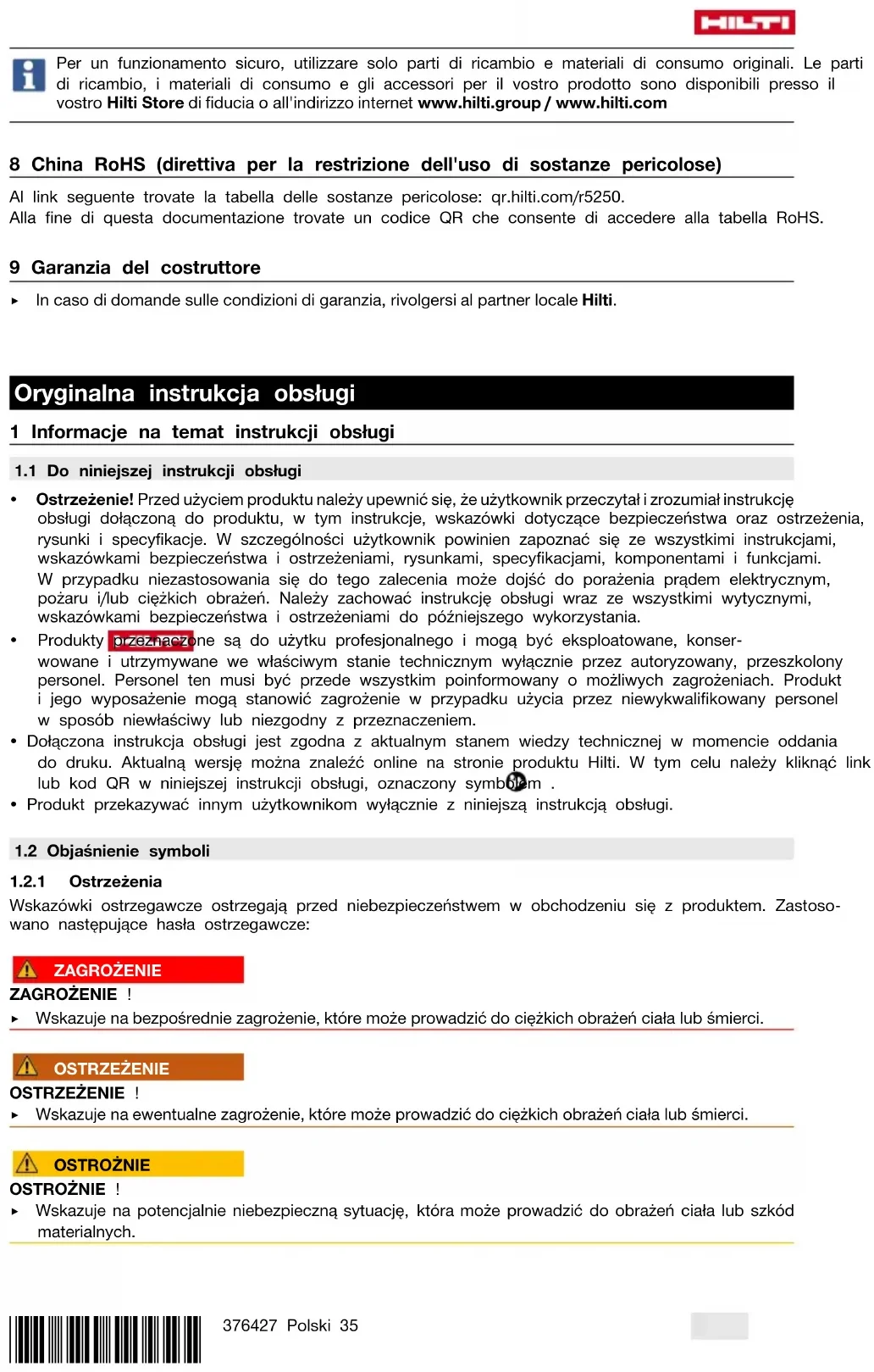 - Po zakończeniu prac konserwacyjnych założyć wszystkie mechanizmy zabezpieczające i skontrolować ich działanie.*376427* 376427 Dansk 41 W celu bezpiecznej pracy stosować wyłącznie oryginalne części zamienne i materiały eksploatacyjne. Dopuszczone przez Hilti części zamienne, materiały eksploatacyjne i wyposażenie produktu są dostępne w lokalnym centrum Hilti Store oraz na: www.hilti.group / www.hilti.com 8 Chińska dyrektywa RoHS (dyrektywa w sprawie ograniczenia stosowania sub- stancji niebezpiecznych) Pod poniższym linkiem znajduje się tabela substancji niebezpiecznych: qr.hilti.com/r5250. Link do tabeli RoHS znajduje się na końcu niniejszej dokumentacji jako kod QR. 9 Gwarancja producenta na urządzenia ▶ W razie pytań dotyczących warunków gwarancji należy skontaktować się z lokalnym przedstawicielem Hilti. Original brugsanvisning 1 Om brugsanvisningen