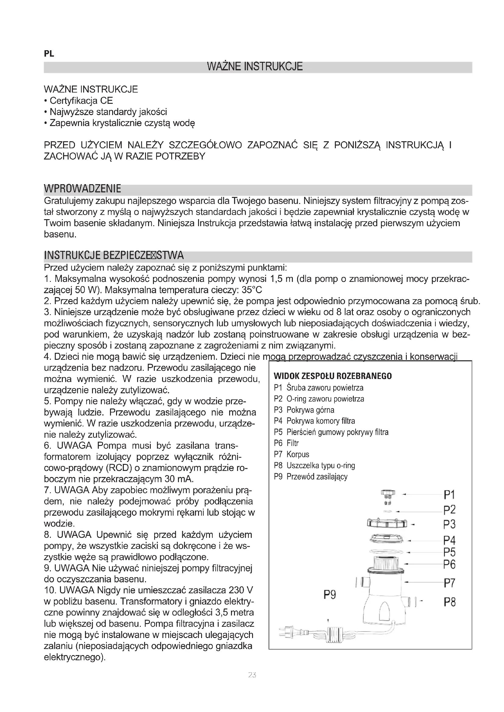 WPROWADZENIE Gratulujemy zakupu najlepszego wsparcia dla Twojego basenu. Niniejszy system ltracyjny z pompą zos- tał stworzony z myślą o najwyższych standardach jakości i będzie zapewniał krystalicznie czystą wodę w Twoim basenie składanym. Niniejsza Instrukcja przedstawia łatwą instalację przed pierwszym użyciem basenu.