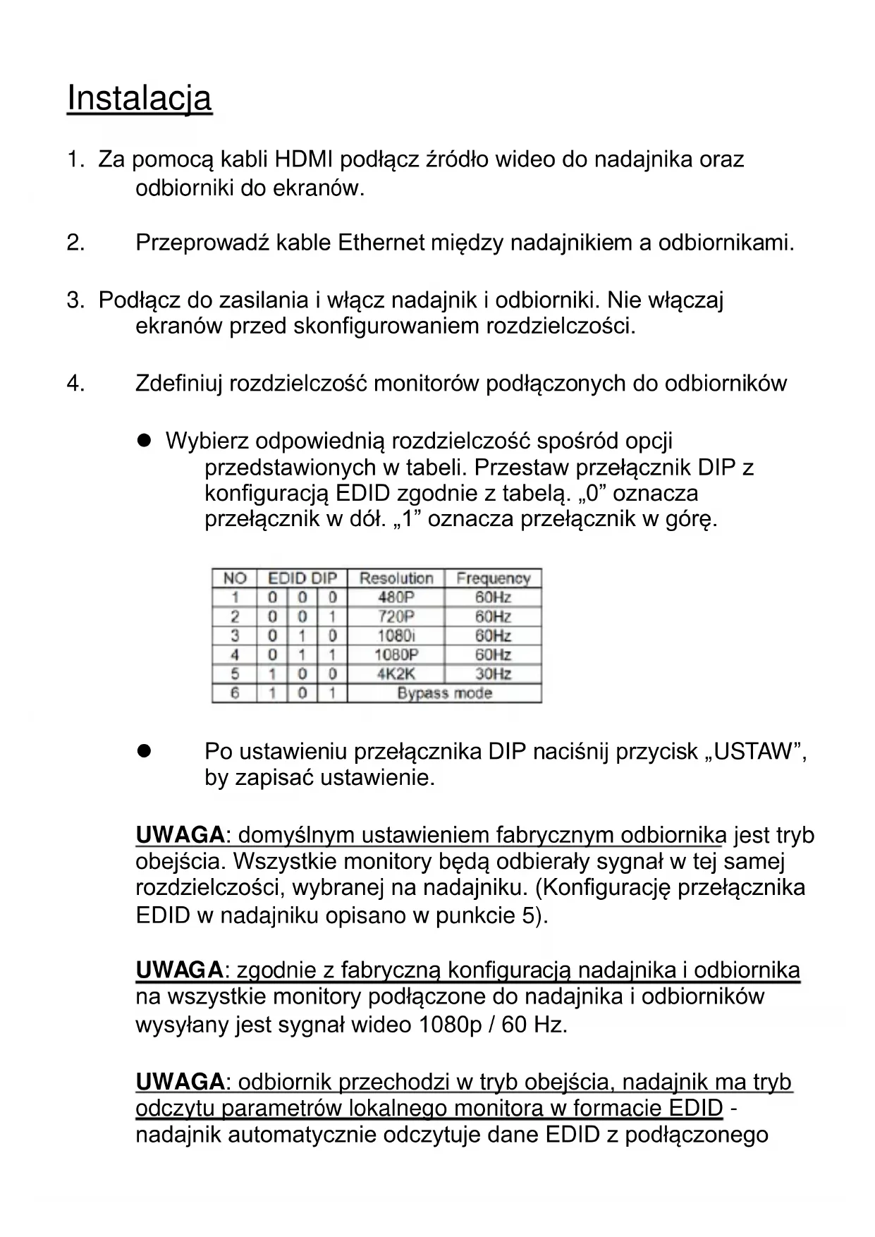 nadajnika. Jeśli przy nadajniku nie jest potrzebny monitor lokalny, pomiń ten krok. Jeśli obraz na monitorze jest nieprawidłowy lub gdy wymagana jest określona rozdzielczość, określ ustawienia jak poniżej: Wybierz odpowiednią rozdzielczość spośród opcji przedstawionych w tabeli. Przestaw przełącznik DIP z konfiguracją EDID zgodnie z tabelą. „0” oznacza przełącznik w dół. „1” oznacza przełącznik w górę. Po ustawieniu przełącznika DIP naciśnij przycisk „USTAW”, by zapisać ustawienie. UWAGA: nadajnik ma domyślne ustawienie fabryczne 1080p / 60 Hz. UWAGA: odbiornik przechodzi w tryb obejścia, nadajnik ma tryb odczytu parametrów lokalnego monitora w formacie EDID - nadajnik automatycznie odczytuje dane EDID z podłączonego monitor i przekazuje te same ustawienia do wszystkich monitorów podłączonych do odbiorników. Jeśli do nadajnika nie jest podłączony żaden monitor lokalny, odczyt danych EDID będzie niemożliwy, co może spowodować wystąpienie błędu.6. Włącz urządzenia po stronie nadajnika: źródło wideo i ewentualny lokalny monitor.