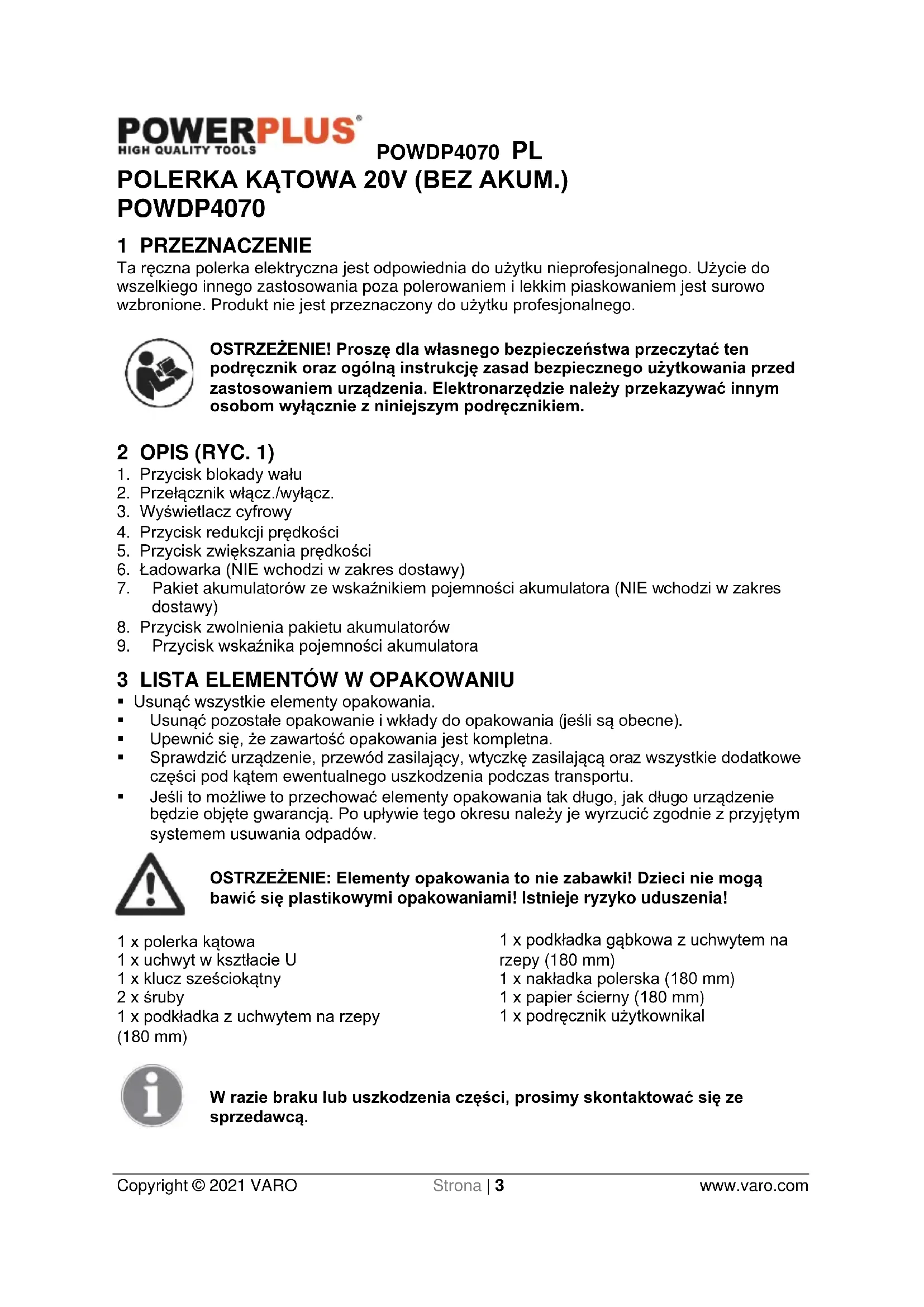 Copyright © 2021 VARO Strona | 3 www.varo.com POLERKA KĄTOWA 20V (BEZ AKUM.) POWDP4070 1 PRZEZNACZENIE Ta ręczna polerka elektryczna jest odpowiednia do użytku nieprofesjonalnego. Użycie do wszelkiego innego zastosowania poza polerowaniem i lekkim piaskowaniem jest surowo wzbronione. Produkt nie jest przeznaczony do użytku profesjonalnego. OSTRZEŻENIE! Proszę dla własnego bezpieczeństwa przeczytać ten podręcznik oraz ogólną instrukcję zasad bezpiecznego użytkowania przed zastosowaniem urządzenia. Elektronarzędzie należy przekazywać innym osobom wyłącznie z niniejszym podręcznikiem. 2 OPIS (RYC. 1)