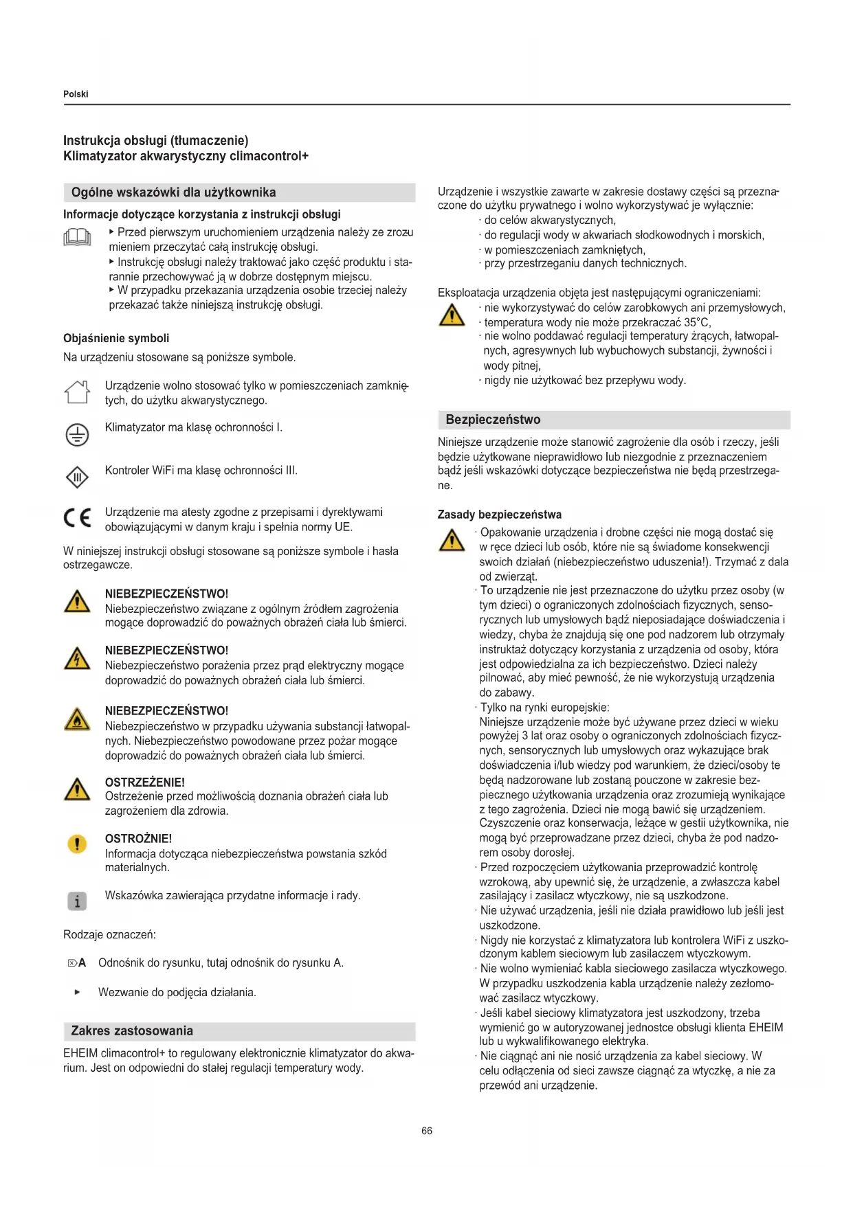 = 0,1 W/l ** = Değer tespiti 1× kapaklı akvaryum, oda sıcaklığı 20°C, Δt = Oda ve su sıcaklığı arasındaki sıcaklık farkı Yedek parçalar Bkz. sayfa 3.66 Polski Instrukcja obsługi (tłumaczenie) Klimatyzator akwarystyczny climacontrol+ Ogólne wskazówki dla użytkownika Informacje dotyczące korzystania z instrukcji obsługi ▶ Przed pierwszym uruchomieniem urządzenia należy ze zrozu