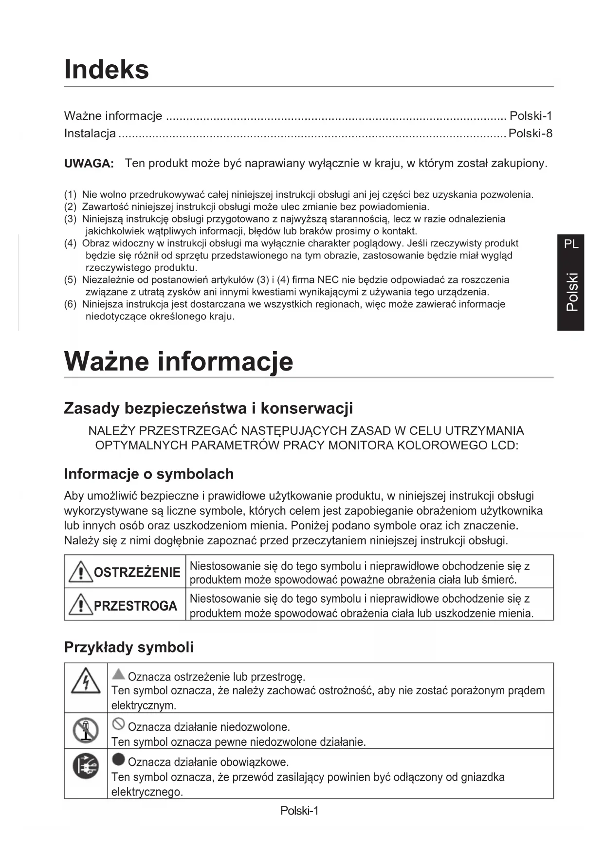 Polski Ważne informacje ..................................................................................................... Polski-1 Instalacja ................................................................................................................... Polski-8 Indeks UWAGA: Ten produkt może być naprawiany wyłącznie w kraju, w którym został zakupiony. (1) Nie wolno przedrukowywać całej niniejszej instrukcji obsługi ani jej części bez uzyskania pozwolenia.(2) Zawartość niniejszej instrukcji obsługi może ulec zmianie bez powiadomienia.(3) Niniejszą instrukcję obsługi przygotowano z najwyższą starannością, lecz w razie odnalezienia jakichkolwiek wątpliwych informacji, błędów lub braków prosimy o kontakt.(4) Obraz widoczny w instrukcji obsługi ma wyłącznie charakter poglądowy. Jeśli rzeczywisty produkt będzie się różnił od sprzętu przedstawionego na tym obrazie, zastosowanie będzie miał wygląd rzeczywistego produktu.(5) Niezależnie od postanowień artykułów (3) i (4) rma NEC nie będzie odpowiadać za roszczenia związane z utratą zysków ani innymi kwestiami wynikającymi z używania tego urządzenia.(6) Niniejsza instrukcja jest dostarczana we wszystkich regionach, więc może zawierać informacje niedotyczące określonego kraju. Ważne informacje Zasady bezpieczeństwa i konserwacji NALEŻY PRZESTRZEGAĆ NASTĘPUJĄCYCH ZASAD W CELU UTRZYMANIA OPTYMALNYCH PARAMETRÓW PRACY MONITORA KOLOROWEGO LCD: Informacje o symbolach Aby umożliwić bezpieczne i prawidłowe użytkowanie produktu, w niniejszej instrukcji obsługi wykorzystywane są liczne symbole, których celem jest zapobieganie obrażeniom użytkownika lub innych osób oraz uszkodzeniom mienia. Poniżej podano symbole oraz ich znaczenie. Należy się z nimi dogłębnie zapoznać przed przeczytaniem niniejszej instrukcji obsługi. OSTRZEŻENIE Niestosowanie się do tego symbolu i nieprawidłowe obchodzenie się z produktem może spowodować poważne obrażenia ciała lub śmierć. PRZESTROGA Niestosowanie się do tego symbolu i nieprawidłowe obchodzenie się z produktem może spowodować obrażenia ciała lub uszkodzenie mienia. Przykłady symboli Oznacza ostrzeżenie lub przestrogę. Ten symbol oznacza, że należy zachować ostrożność, aby nie zostać porażonym prądem elektrycznym. Oznacza działanie niedozwolone. Ten symbol oznacza pewne niedozwolone działanie. Oznacza działanie obowiązkowe. Ten symbol oznacza, że przewód zasilający powinien być odłączony od gniazdka elektrycznego.Polski-2 OSTRZEŻENIE