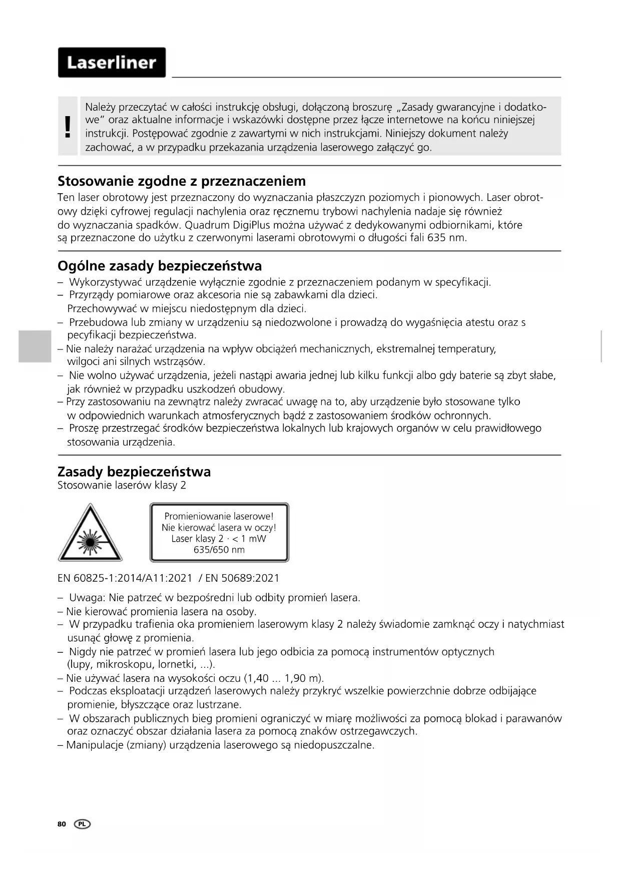 Stosowanie zgodne zprzeznaczeniem Ten laser obrotowy jest przeznaczony do wyznaczania płaszczyzn poziomych i pionowych. Laser obrot- owy dzięki cyfrowej regulacji nachylenia oraz ręcznemu trybowi nachylenia nadaje się również do wyznaczania spadków. Quadrum DigiPlus można używać z dedykowanymi odbiornikami, które są przeznaczone do użytku z czerwonymi laserami obrotowymi o długości fali 635 nm. Ogólne zasady bezpieczeństwa – Wykorzystywać urządzenie wyłącznie zgodnie z przeznaczeniem podanym w specykacji. – Przyrządy pomiarowe oraz akcesoria nie są zabawkami dla dzieci. Przechowywać wmiejscu niedostępnym dla dzieci. – Przebudowa lub zmiany w urządzeniu są niedozwolone i prowadzą do wygaśnięcia atestu oraz s pecykacji bezpieczeństwa. – Nie należy narażać urządzenia na wpływ obciążeń mechanicznych, ekstremalnej temperatury, wilgoci ani silnych wstrząsów. – Nie wolno używać urządzenia, jeżeli nastąpi awaria jednej lub kilku funkcji albo gdy baterie są zbyt słabe, jak również wprzypadku uszkodzeń obudowy. – Przy zastosowaniu na zewnątrz należy zwracać uwagę na to, aby urządzenie było stosowane tylko w odpowiednich warunkach atmosferycznych bądź z zastosowaniem środków ochronnych. – Proszę przestrzegać środków bezpieczeństwa lokalnych lub krajowych organów w celu prawidłowego stosowania urządzenia. EN 60825-1:2014/A11:2021 / EN 50689:2021 – Uwaga: Nie patrzeć w bezpośredni lub odbity promień lasera. – Nie kierować promienia lasera na osoby. – W przypadku traenia oka promieniem laserowym klasy 2 należy świadomie zamknąć oczy i natychmiast usunąć głowę z promienia. – Nigdy nie patrzeć w promień lasera lub jego odbicia za pomocą instrumentów optycznych (lupy, mikroskopu, lornetki, ...). – Nie używać lasera na wysokości oczu (1,40 ... 1,90 m). – Podczas eksploatacji urządzeń laserowych należy przykryć wszelkie powierzchnie dobrze odbijające promienie, błyszczące oraz lustrzane. – W obszarach publicznych bieg promieni ograniczyć w miarę możliwości za pomocą blokad i parawanów oraz oznaczyć obszar działania lasera za pomocą znaków ostrzegawczych. – Manipulacje (zmiany) urządzenia laserowego są niedopuszczalne. Promieniowanie laserowe! Nie kierować lasera w oczy! Laser klasy 2 · < 1 mW 635/650 nm Zasady bezpieczeństwa Stosowanie laserów klasy 2 PLQuadrum DigiPlus