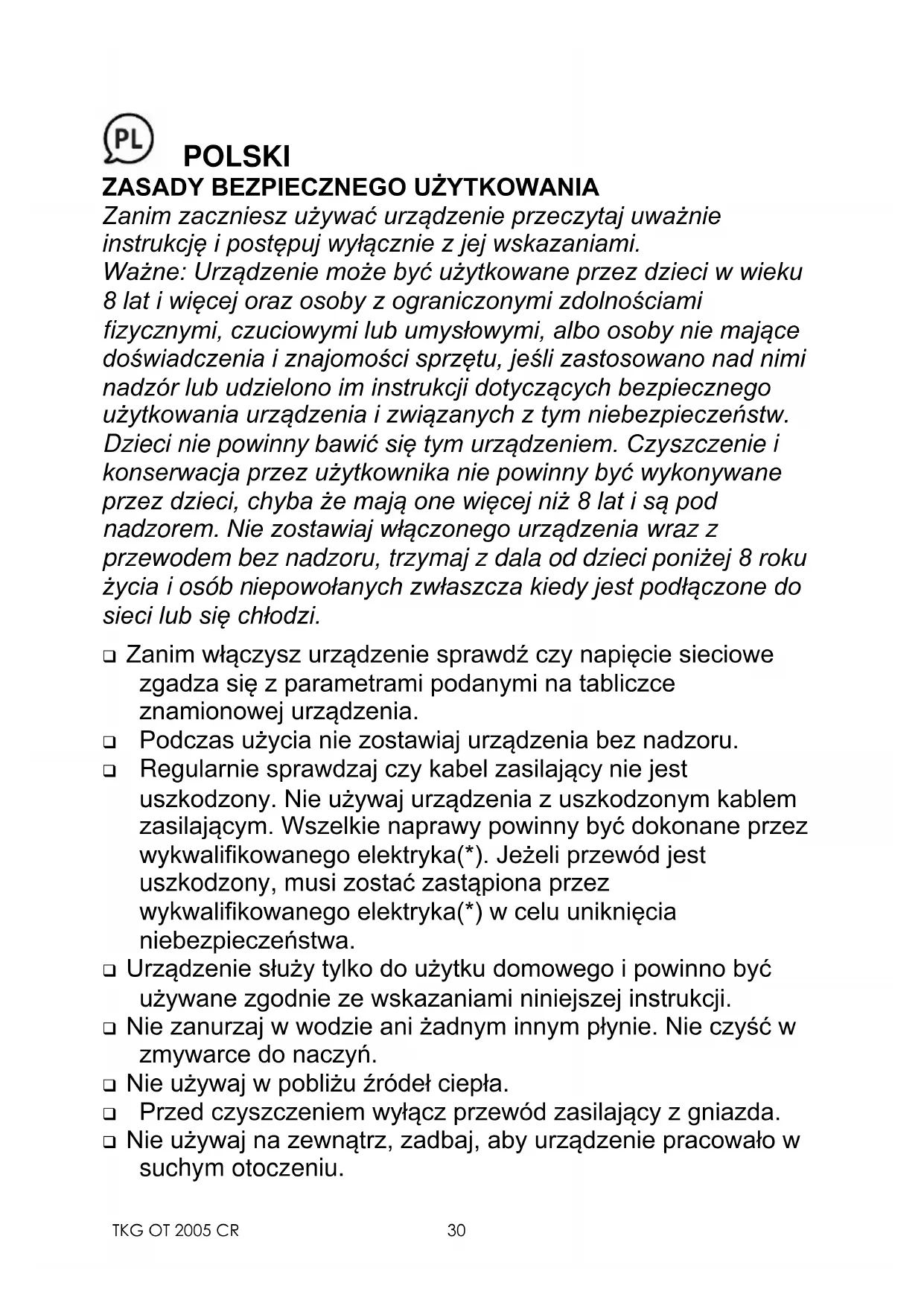 - Nie używaj materiałów czyszczących rysujących i ścierających. Nie zanurzaj urządzenia w wodzie lub innym płynie.TKG OT 2005 CR
