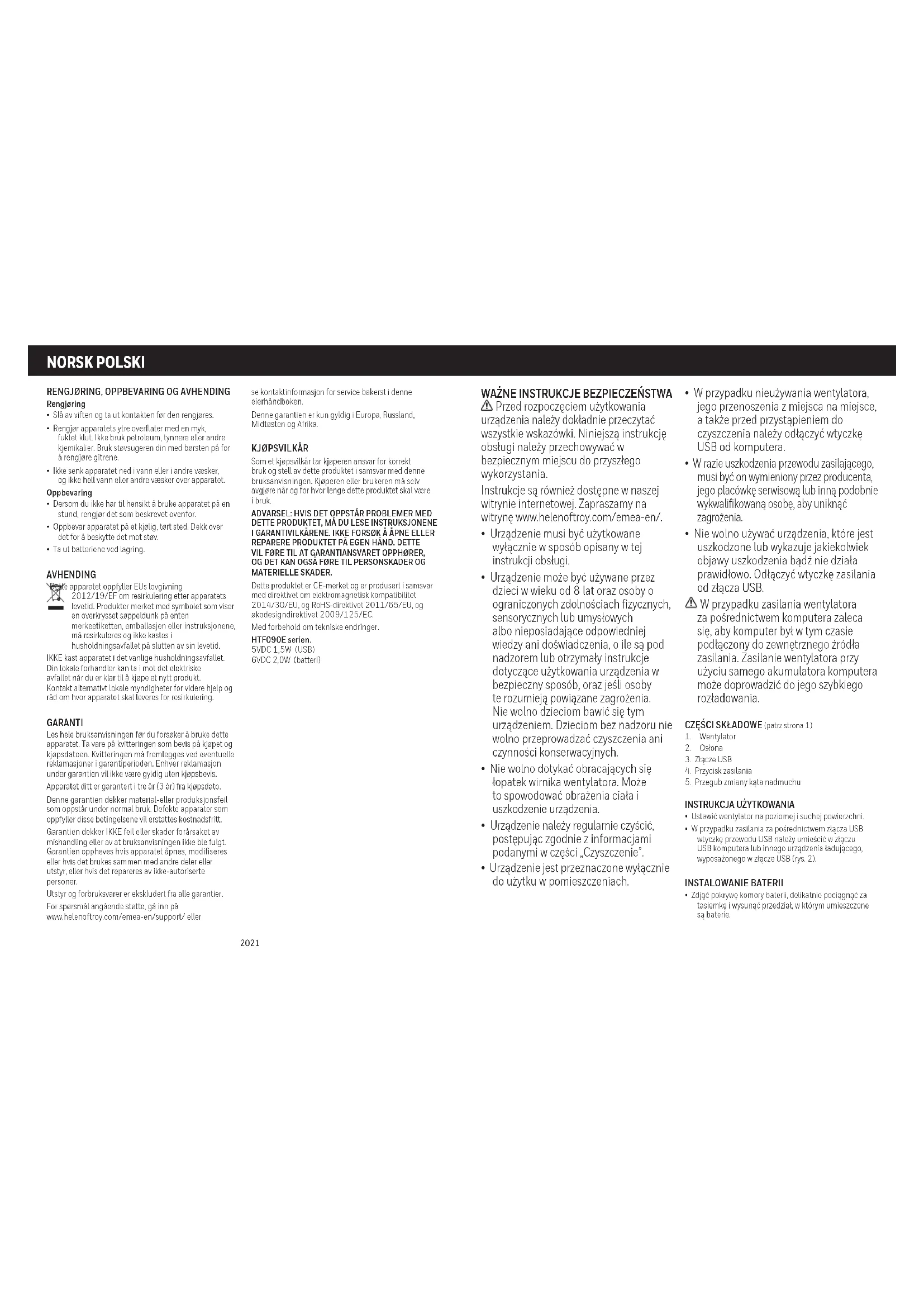 To urządzenie jest zgodne z przepisami UE 2012/19/WE dotyczącymi zakończenia okresu eksploatacji. Produkty opatrzone symbolem przekreślonego pojemnika na śmieci, znajdującym się na tabliczce znamionowej, opakowaniu lub w instrukcji, nie mogą być wyrzucane razem z domowymi odpadkami, gdy upłynie ich czas przydatności użytkowej. NIE WOLNO wyrzucać urządzenia do kosza na normalne odpadki domowe. Lokalny sprzedawca urządzenia może prowadzić program odbioru zużytych urządzeń w chwili zakupu nowych produktów. Można również skontaktować się z władzami lokalnymi, aby uzyskać pomoc i porady w zakresie przekazania urządzenia do utylizacji. GWARANCJA Przed rozpoczęciem eksploatacji należy zapoznać się ze wszystkimi instrukcjami. Zachować paragon z datą jako dowód zakupu. W przypadku roszczeń gwarancyjnych należy przedstawić dowód zakupu. Reklamacje bez dowodu zakupu zostaną odrzucone. Producent udziela gwarancji na produkt na okres trzech (3) lat od daty zakupu. Gwarancja obejmuje defekty materiału i robocizny, jakie wystąpiły podczas normalnego użytkowania; wadliwe urządzenia spełniające te kryteria zostaną wymienione bezpłatnie. Gwarancja NIE obejmuje wad ani szkód wynikłych z nieprawidłowego użytkowania lub nieprzestrzegania instrukcji. Gwarancja ulega unieważnieniu w przypadku otwarcia obudowy urządzenia, naruszenia jej lub eksploatowania urządzenia z innymi częściami lub akcesoriami oraz w przypadku wykonywania napraw przez osoby nieuprawione. Gwarancja nie obejmuje akcesoriów ani materiałów eksploatacyjnych. Pomoc techniczną można uzyskać odwiedzając witrynę www.helenoftroy.com/emea-en/support/ lub korzystając z informacji o punktach serwisowych zamieszczonych na końcu tej instrukcji obsługi. Gwarancja obowiązuje wyłącznie w Europie, Rosji, na Bliskim Wschodzie i w Afryce. WARUNEK KUPNA Jako warunek kupna nabywca bierze na siebie odpowiedzialność za prawidłowe użytkowanie i konserwację niniejszego produktu, zgodnie z niniejszą instrukcją użytkowania. Nabywca lub użytkownik muszą samodzielnie podejmować decyzję o tym, kiedy i jak długo ma być użytkowany niniejszy produkt.