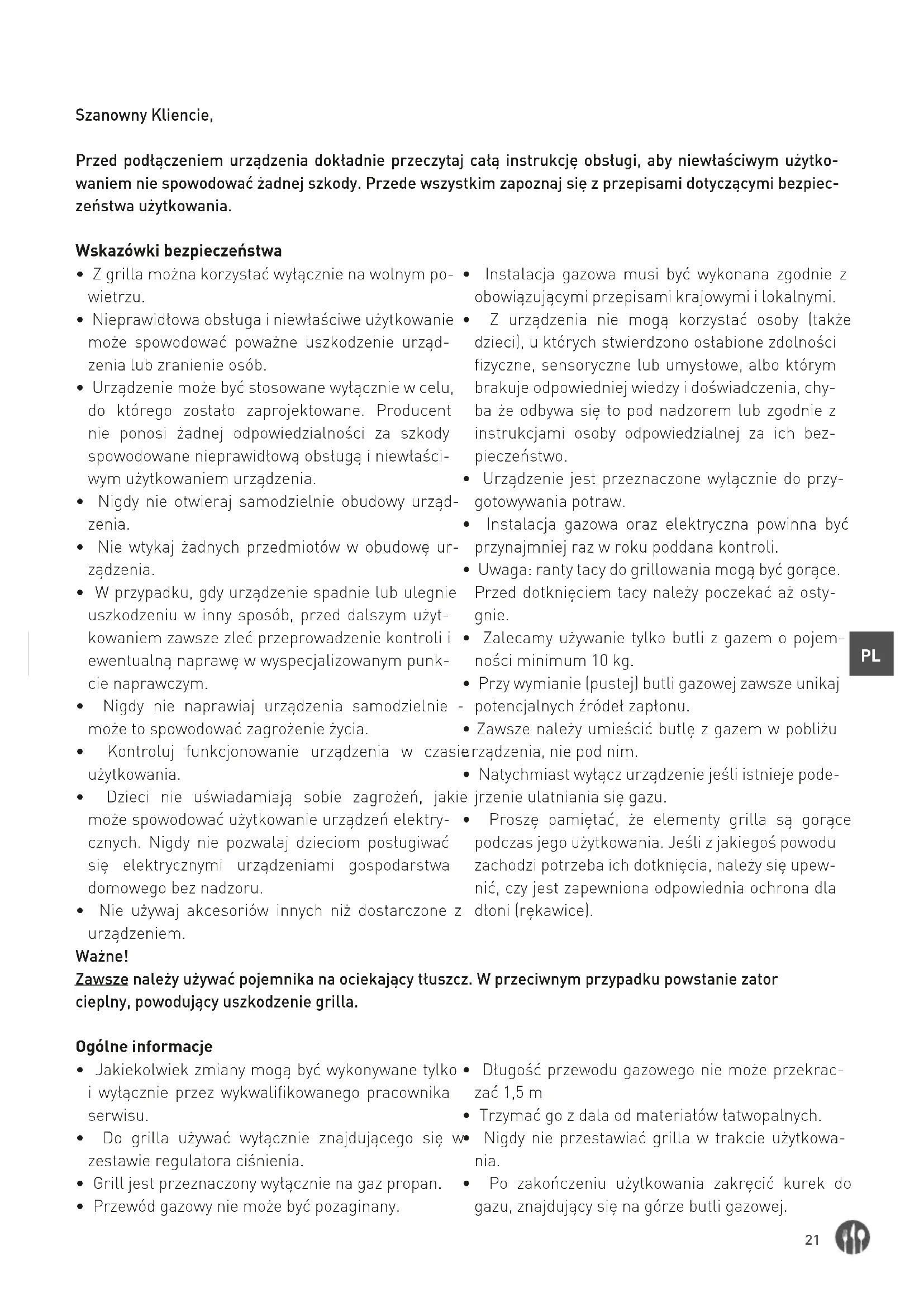 - Proszę pamiętać, że elementy grilla są gorące podczas jego użytkowania. Jeśli z jakiegoś powodu zachodzi potrzeba ich dotknięcia, należy się upew- nić, czy jest zapewniona odpowiednia ochrona dla dłoni (rękawice). Ważne! Zawsze należy używać pojemnika na ociekający tłuszcz. W przeciwnym przypadku powstanie zator cieplny, powodujący uszkodzenie grilla. Ogólne informacje