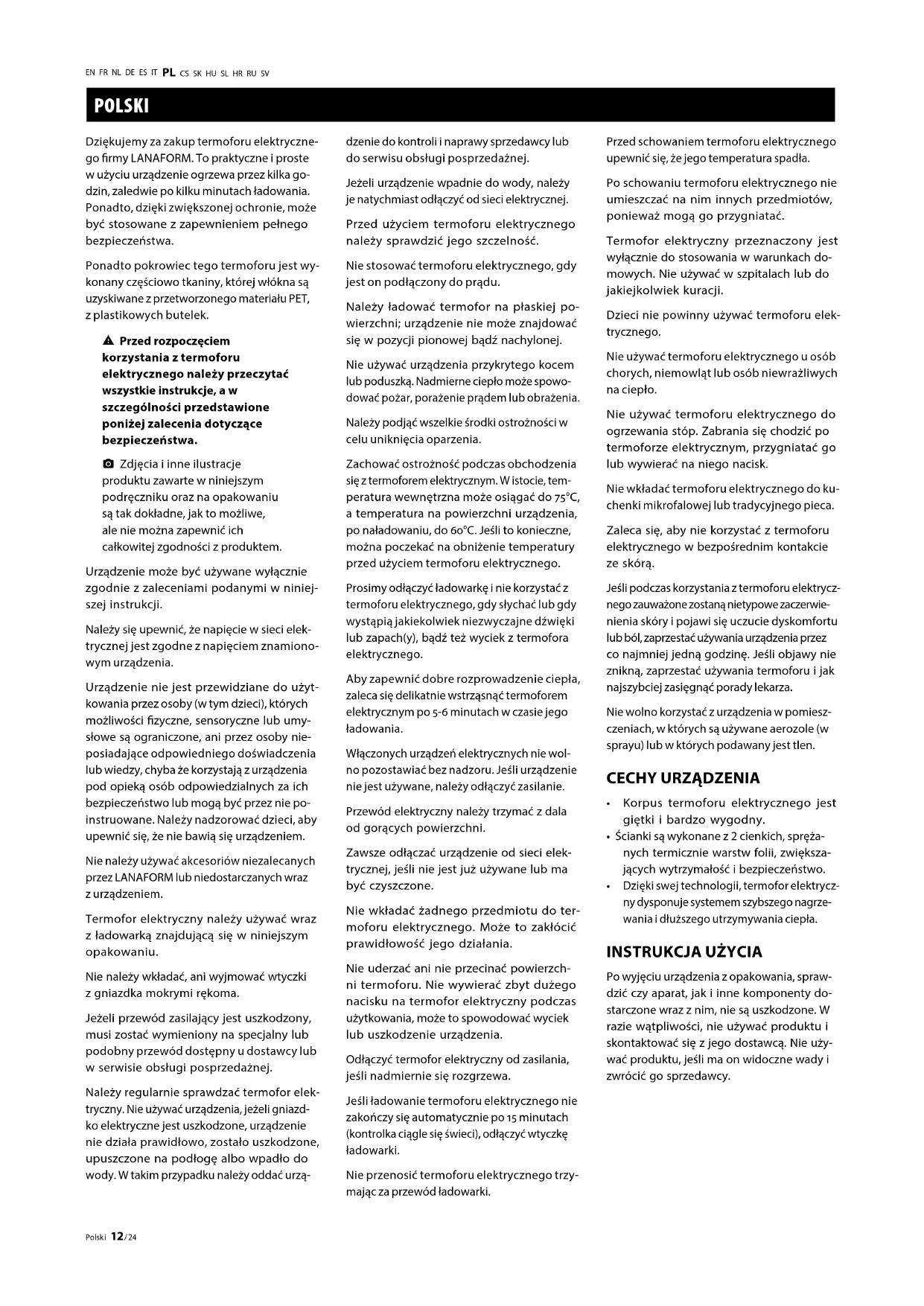 Zdjęcia i inne ilustracje produktu zawarte w niniejszym podręczniku oraz na opakowaniu są tak dokładne, jak to możliwe, ale nie można zapewnić ich całkowitej zgodności z produktem. Urządzenie może być używane wyłącznie zgodnie z zaleceniami podanymi w niniej- szej instrukcji. Należy się upewnić, że napięcie w sieci elek- trycznej jest zgodne z napięciem znamiono- wym urządzenia. Urządzenie nie jest przewidziane do użyt- kowania przez osoby (w tym dzieci), których możliwości zyczne, sensoryczne lub umy- słowe są ograniczone, ani przez osoby nie- posiadające odpowiedniego doświadczenia lub wiedzy, chyba że korzystają z urządzenia pod opieką osób odpowiedzialnych za ich bezpieczeństwo lub mogą być przez nie po- instruowane. Należy nadzorować dzieci, aby upewnić się, że nie bawią się urządzeniem. Nie należy używać akcesoriów niezalecanych przez LANAFORM lub niedostarczanych wraz z urządzeniem. Termofor elektryczny należy używać wraz z ładowarką znajdującą się w niniejszym opakowaniu. Nie należy wkładać, ani wyjmować wtyczki z gniazdka mokrymi rękoma. Jeżeli przewód zasilający jest uszkodzony, musi zostać wymieniony na specjalny lub podobny przewód dostępny u dostawcy lub w serwisie obsługi posprzedażnej. Należy regularnie sprawdzać termofor elek- tryczny. Nie używać urządzenia, jeżeli gniazd- ko elektryczne jest uszkodzone, urządzenie nie działa prawidłowo, zostało uszkodzone, upuszczone na podłogę albo wpadło do wody. W takim przypadku należy oddać urzą- dzenie do kontroli i naprawy sprzedawcy lub do serwisu obsługi posprzedażnej. Jeżeli urządzenie wpadnie do wody, należy je natychmiast odłączyć od sieci elektrycznej. Przed użyciem termoforu elektrycznego należy sprawdzić jego szczelność. Nie stosować termoforu elektrycznego, gdy jest on podłączony do prądu. Należy ładować termofor na płaskiej po- wierzchni; urządzenie nie może znajdować się w pozycji pionowej bądź nachylonej. Nie używać urządzenia przykrytego kocem lub poduszką. Nadmierne ciepło może spowo- dować pożar, porażenie prądem lub obrażenia. Należy podjąć wszelkie środki ostrożności w celu uniknięcia oparzenia. Zachować ostrożność podczas obchodzenia się z termoforem elektrycznym. W istocie, tem- peratura wewnętrzna może osiągać do 75°C, a temperatura na powierzchni urządzenia, po naładowaniu, do 60°C. Jeśli to konieczne, można poczekać na obniżenie temperatury przed użyciem termoforu elektrycznego. Prosimy odłączyć ładowarkę i nie korzystać z termoforu elektrycznego, gdy słychać lub gdy wystąpią jakiekolwiek niezwyczajne dźwięki lub zapach(y), bądź też wyciek z termofora elektrycznego. Aby zapewnić dobre rozprowadzenie ciepła, zaleca się delikatnie wstrząsnąć termoforem elektrycznym po 5-6 minutach w czasie jego ładowania. Włączonych urządzeń elektrycznych nie wol- no pozostawiać bez nadzoru. Jeśli urządzenie nie jest używane, należy odłączyć zasilanie. Przewód elektryczny należy trzymać z dala od gorących powierzchni. Zawsze odłączać urządzenie od sieci elek- trycznej, jeśli nie jest już używane lub ma być czyszczone. Nie wkładać żadnego przedmiotu do ter- moforu elektrycznego. Może to zakłócić prawidłowość jego działania. Nie uderzać ani nie przecinać powierzch- ni termoforu. Nie wywierać zbyt dużego nacisku na termofor elektryczny podczas użytkowania, może to spowodować wyciek lub uszkodzenie urządzenia. Odłączyć termofor elektryczny od zasilania, jeśli nadmiernie się rozgrzewa. Jeśli ładowanie termoforu elektrycznego nie zakończy się automatycznie po 15 minutach (kontrolka ciągle się świeci), odłączyć wtyczkę ładowarki. Nie przenosić termoforu elektrycznego trzy- mając za przewód ładowarki. Przed schowaniem termoforu elektrycznego upewnić się, że jego temperatura spadła. Po schowaniu termoforu elektrycznego nie umieszczać na nim innych przedmiotów, ponieważ mogą go przygniatać. Termofor elektryczny przeznaczony jest wyłącznie do stosowania w warunkach do- mowych. Nie używać w szpitalach lub do jakiejkolwiek kuracji. Dzieci nie powinny używać termoforu elek- trycznego. Nie używać termoforu elektrycznego u osób chorych, niemowląt lub osób niewrażliwych na ciepło. Nie używać termoforu elektrycznego do ogrzewania stóp. Zabrania się chodzić po termoforze elektrycznym, przygniatać go lub wywierać na niego nacisk. Nie wkładać termoforu elektrycznego do ku- chenki mikrofalowej lub tradycyjnego pieca. Zaleca się, aby nie korzystać z termoforu elektrycznego w bezpośrednim kontakcie ze skórą. Jeśli podczas korzystania z termoforu elektrycz- nego zauważone zostaną nietypowe zaczerwie- nienia skóry i pojawi się uczucie dyskomfortu lub ból, zaprzestać używania urządzenia przez co najmniej jedną godzinę. Jeśli objawy nie znikną, zaprzestać używania termoforu i jak najszybciej zasięgnąć porady lekarza. Nie wolno korzystać z urządzenia w pomiesz- czeniach, w których są używane aerozole (w sprayu) lub w których podawany jest tlen.