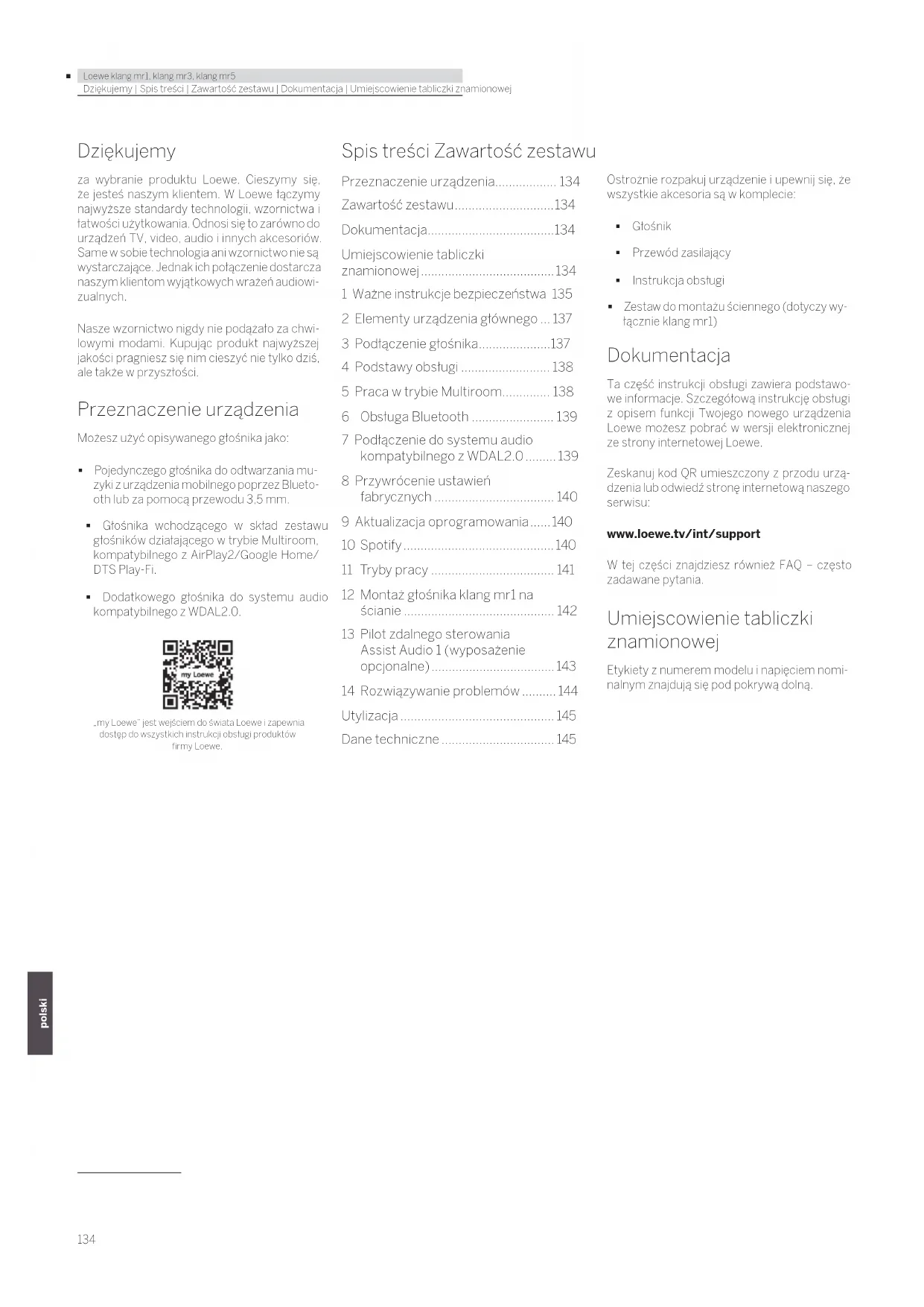 - Loewe klang mr1, klang mr3, klang mr5 deutsch norskDziękujemy | Spis treści | Zawartość zestawu | Dokumentacja | Umiejscowienie tabliczki znamionowej Dziękujemy za wybranie produktu Loewe. Cieszymy się, że jesteś naszym klientem. W Loewe łączymy najwyższe standardy technologii, wzornictwa i łatwości użytkowania. Odnosi się to zarówno do urządzeń TV, video, audio i innych akcesoriów. Same w sobie technologia ani wzornictwo nie są wystarczające. Jednak ich połączenie dostarcza naszym klientom wyjątkowych wrażeń audiowi- zualnych. Nasze wzornictwo nigdy nie podążało za chwi- lowymi modami. Kupując produkt najwyższej jakości pragniesz się nim cieszyć nie tylko dziś, ale także w przyszłości. Przeznaczenie urządzenia Możesz użyć opisywanego głośnika jako: Pojedynczego głośnika do odtwarzania mu- zyki z urządzenia mobilnego poprzez Blueto- oth lub za pomocą przewodu 3,5 mm. Głośnika wchodzącego w skład zestawu głośników działającego w trybie Multiroom, kompatybilnego z AirPlay2/Google Home/ DTS Play-Fi. Dodatkowego głośnika do systemu audio kompatybilnego z WDAL2.0. „my Loewe” jest wejściem do świata Loewe i zapewnia dostęp do wszystkich instrukcji obsługi produktów rmy Loewe. Spis treści Zawartość zestawu Ostrożnie rozpakuj urządzenie i upewnij się, że wszystkie akcesoria są w komplecie: Głośnik Przewód zasilający Instrukcja obsługi Zestaw do montażu ściennego (dotyczy wy- łącznie klang mr1) Dokumentacja Ta część instrukcji obsługi zawiera podstawo- we informacje. Szczegółową instrukcję obsługi z opisem funkcji Twojego nowego urządzenia Loewe możesz pobrać w wersji elektronicznej ze strony internetowej Loewe. Zeskanuj kod QR umieszczony z przodu urzą- dzenia lub odwiedź stronę internetową naszego serwisu: www.loewe.tv/int/support W tej części znajdziesz również FAQ – często zadawane pytania. Umiejscowienie tabliczki znamionowej Etykiety z numerem modelu i napięciem nomi- nalnym znajdują się pod pokrywą dolną. Przeznaczenie urządzenia p. 134