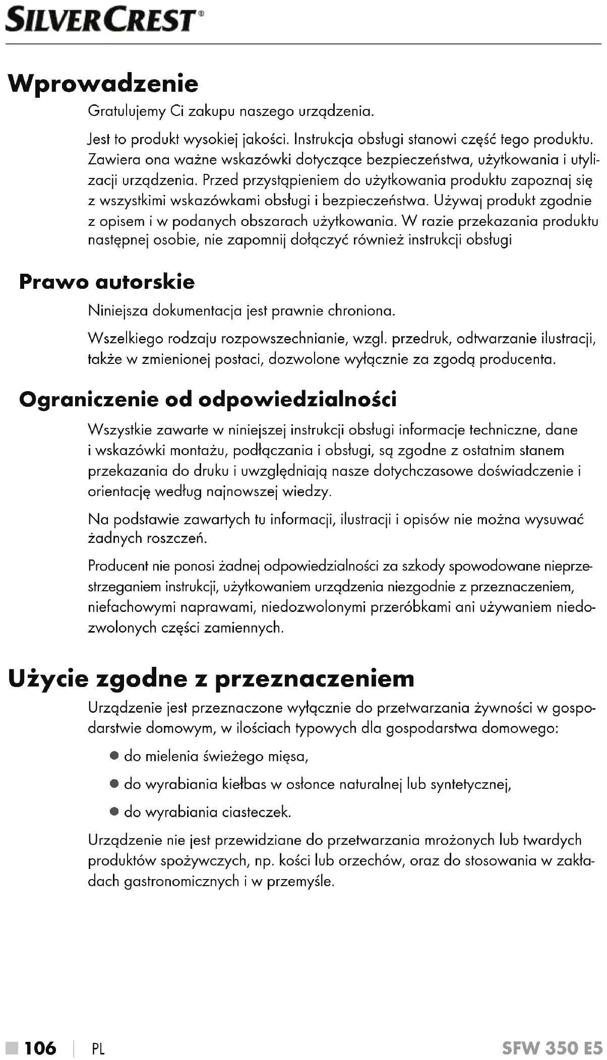 PL SFW 350 E5 Wprowadzenie Gratulujemy Ci zakupu naszego urządzenia. Jest to produkt wysokiej jakości. Instrukcja obsługi stanowi część tego produktu. Zawiera ona ważne wskazówki dotyczące bezpieczeństwa, użytkowania i utyli- zacji urządzenia. Przed przystąpieniem do użytkowania produktu zapoznaj się z wszystkimi wskazówkami obsługi i bezpieczeństwa. Używaj produkt zgodnie z opisem i w podanych obszarach użytkowania. W razie przekazania produktu następnej osobie, nie zapomnij dołączyć również instrukcji obsługi Prawo autorskie Niniejsza dokumentacja jest prawnie chroniona. Wszelkiego rodzaju rozpowszechnianie, wzgl. przedruk, odtwarzanie ilustracji, także w zmienionej postaci, dozwolone wyłącznie za zgodą producenta. Ograniczenie od odpowiedzialności Wszystkie zawarte w niniejszej instrukcji obsługi informacje techniczne, dane i wskazówki montażu, podłączania i obsługi, są zgodne z ostatnim stanem przekazania do druku i uwzględniają nasze dotychczasowe doświadczenie i orientację według najnowszej wiedzy. Na podstawie zawartych tu informacji, ilustracji i opisów nie można wysuwać żadnych roszczeń. Producent nie ponosi żadnej odpowiedzialności za szkody spowodowane nieprze- strzeganiem instrukcji, użytkowaniem urządzenia niezgodnie z przeznaczeniem, niefachowymi naprawami, niedozwolonymi przeróbkami ani używaniem niedo- zwolonych części zamiennych. Użycie zgodne z przeznaczeniem Urządzenie jest przeznaczone wyłącznie do przetwarzania żywności w gospo- darstwie domowym, w ilościach typowych dla gospodarstwa domowego: ▯ do mielenia świeżego mięsa, ▯ do wyrabiania kiełbas w osłonce naturalnej lub syntetycznej, ▯ do wyrabiania ciasteczek. Urządzenie nie jest przewidziane do przetwarzania mrożonych lub twardych produktów spożywczych, np. kości lub orzechów, oraz do stosowania w zakła- dach gastronomicznych i w przemyśle.PL