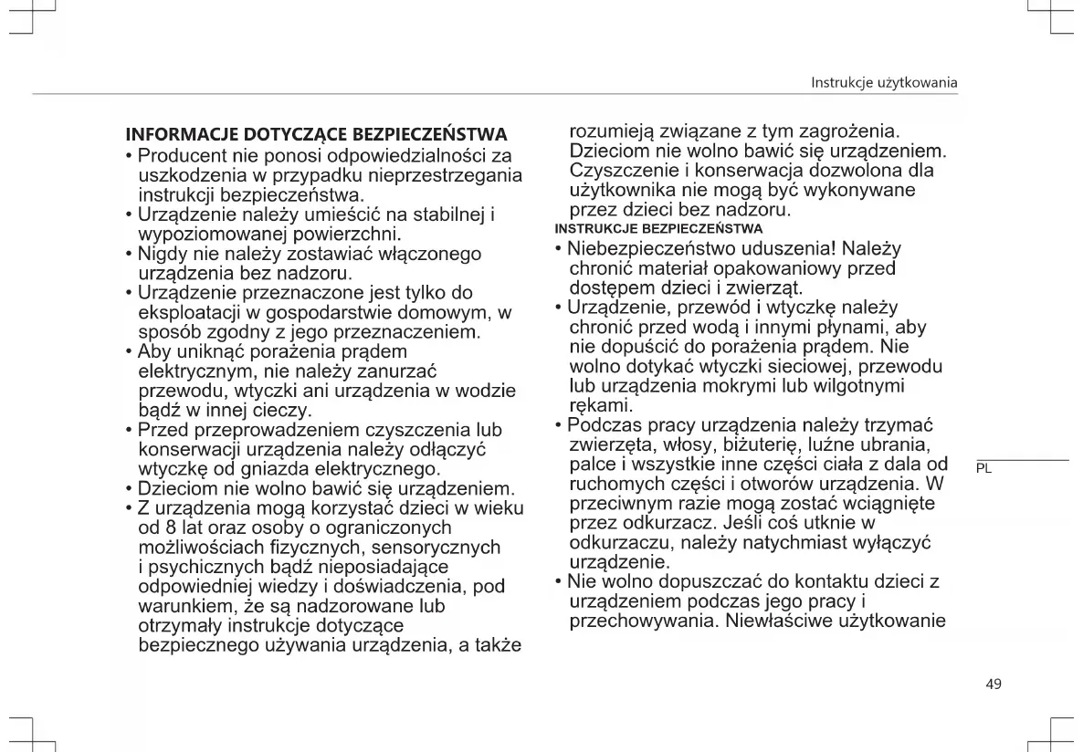 - Nie wolno dopuszczać do kontaktu dzieci z urządzeniem podczas jego pracy i przechowywania. Niewłaściwe użytkowanie PLInstrukcje użytkowania