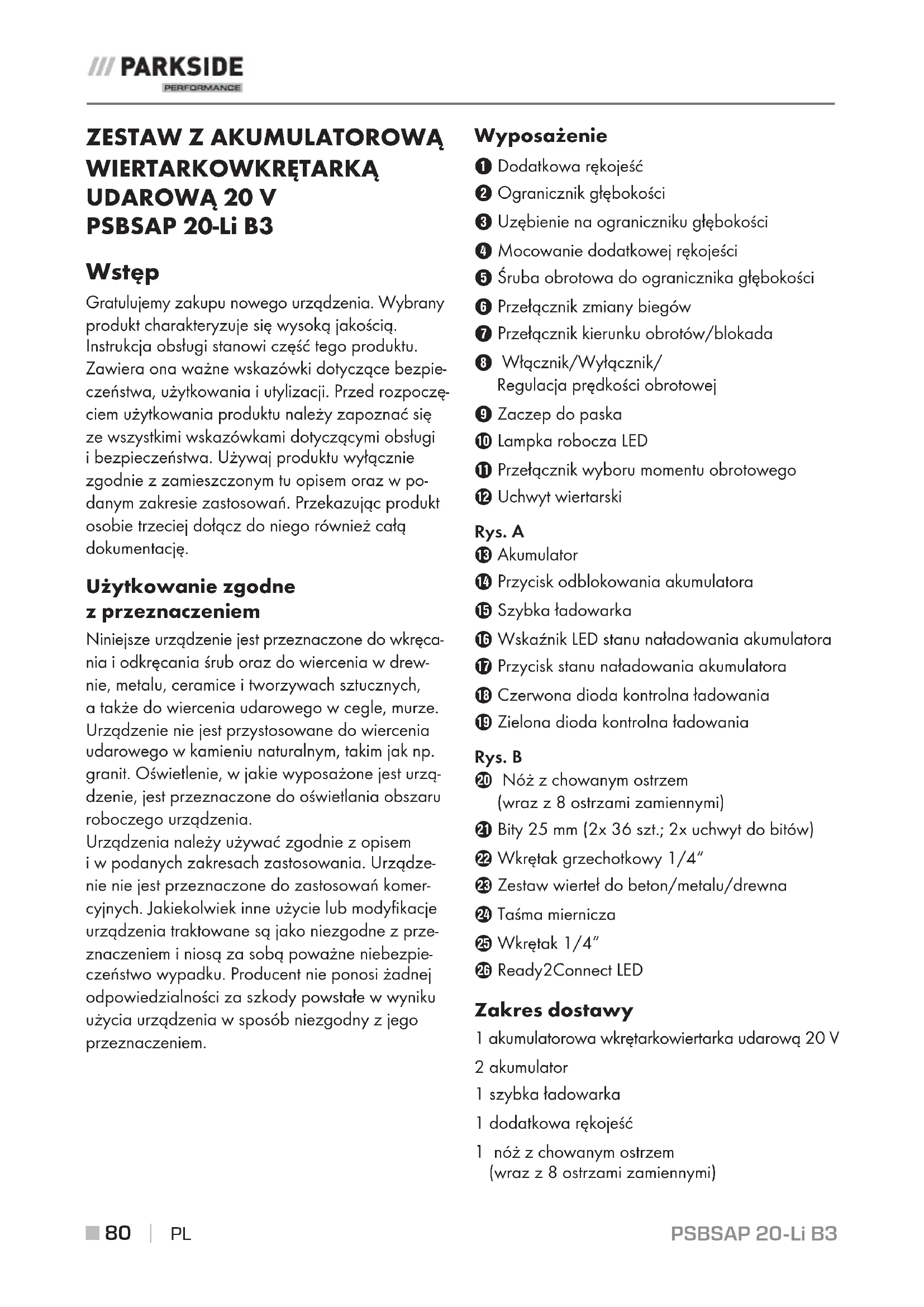 PSBSAP 20Li B3 - Wiertarka PARKSIDE - Bezpłatna instrukcja obsługi