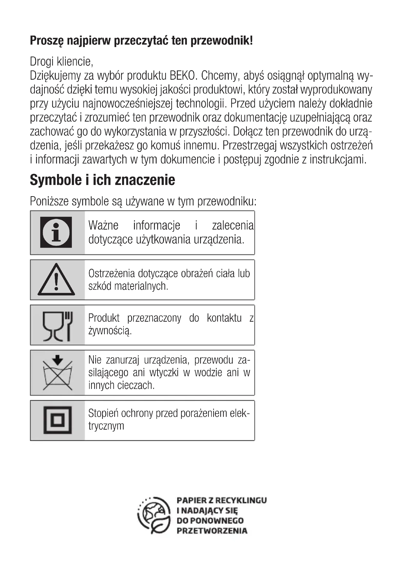 Prima di contattare l’assistenza tecnica, al fine di agevolare la gestione della chiamata, è necessario avere a portata di mano il modello del prodotto e il documento fiscale di acquisto.Proszę najpierw przeczytać ten przewodnik! Drogi kliencie, Dziękujemy za wybór produktu BEKO. Chcemy, abyś osiągnął optymalną wy- dajność dzięki temu wysokiej jakości produktowi, który został wyprodukowany przy użyciu najnowocześniejszej technologii. Przed użyciem należy dokładnie przeczytać i zrozumieć ten przewodnik oraz dokumentację uzupełniającą oraz zachować go do wykorzystania w przyszłości. Dołącz ten przewodnik do urzą- dzenia, jeśli przekażesz go komuś innemu. Przestrzegaj wszystkich ostrzeżeń i informacji zawartych w tym dokumencie i postępuj zgodnie z instrukcjami. Symbole i ich znaczenie Poniższe symbole są używane w tym przewodniku: