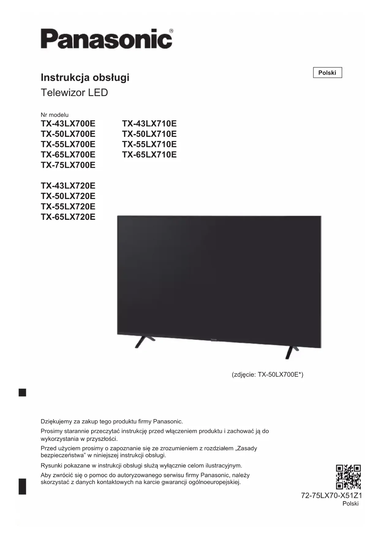 Отпечатано в Китай72-75LX70-X51Z1 Nr modelu TX-43LX700E TX-50LX700E TX-55LX700E TX-65LX700E TX-75LX700E TX-43LX720E TX-50LX720E TX-55LX720E TX-65LX720E TX-43LX710E TX-50LX710E TX-55LX710E TX-65LX710E Instrukcja obsługi Telewizor LED Polski Dziękujemy za zakup tego produktu firmy Panasonic. Prosimy starannie przeczytać instrukcję przed włączeniem produktu i zachować ją do wykorzystania w przyszłości. Przed użyciem prosimy o zapoznanie się ze zrozumieniem z rozdziałem „Zasady bezpieczeństwa” w niniejszej instrukcji obsługi. Rysunki pokazane w instrukcji obsługi służą wyłącznie celom ilustracyjnym. Aby zwrócić się o pomoc do autoryzowanego serwisu firmy Panasonic, należy skorzystać z danych kontaktowych na karcie gwarancji ogólnoeuropejskiej. (zdjęcie: TX-50LX700E*) PolskiPolski