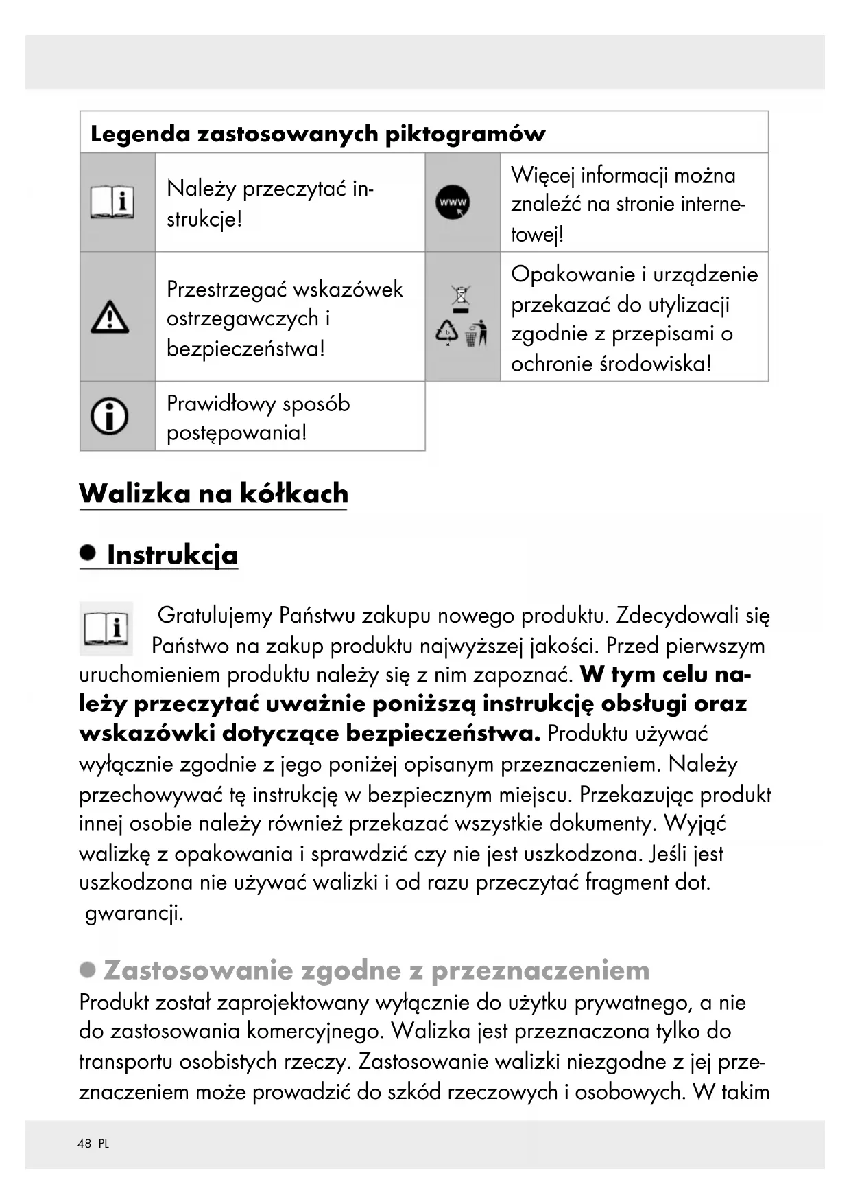 Opakowanie i urządzenie przekazać do utylizacji zgodnie z przepisami o ochronie środowiska! Prawidłowy sposób postępowania! Walizka na kółkach Instrukcja Gratulujemy Państwu zakupu nowego produktu. Zdecydowali się Państwo na zakup produktu najwyższej jakości. Przed pierwszym uruchomieniem produktu należy się z nim zapoznać. W tym celu na- leży przeczytać uważnie poniższą instrukcję obsługi oraz wskazówki dotyczące bezpieczeństwa. Produktu używać wyłącznie zgodnie z jego poniżej opisanym przeznaczeniem. Należy przechowywać tę instrukcję w bezpiecznym miejscu. Przekazując produkt innej osobie należy również przekazać wszystkie dokumenty. Wyjąć walizkę z opakowania i sprawdzić czy nie jest uszkodzona. Jeśli jest uszkodzona nie używać walizki i od razu przeczytać fragment dot. gwarancji. Zastosowanie zgodne z przeznaczeniem Produkt został zaprojektowany wyłącznie do użytku prywatnego, a nie do zastosowania komercyjnego. Walizka jest przeznaczona tylko do transportu osobistych rzeczy. Zastosowanie walizki niezgodne z jej prze- znaczeniem może prowadzić do szkód rzeczowych i osobowych. W takim49 PL przypadku producent lub dystrybutor nie ponosi odpowiedzialności za powstałe szkody. Walizka nie jest zabawką. Opis części