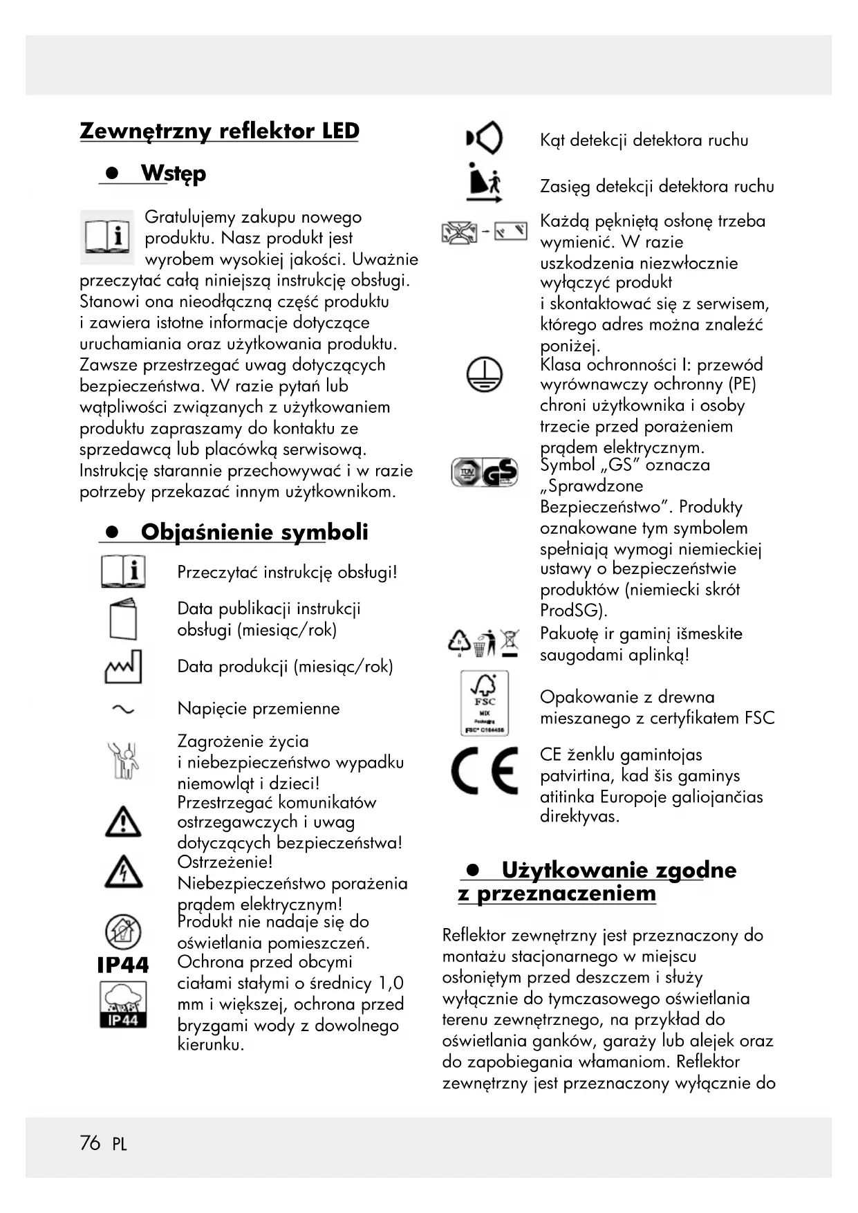 Zewnętrzny reektor LED z Wstęp Gratulujemy zakupu nowego produktu. Nasz produkt jest wyrobem wysokiej jakości. Uważnie przeczytać całą niniejszą instrukcję obsługi. Stanowi ona nieodłączną część produktu i zawiera istotne informacje dotyczące uruchamiania oraz użytkowania produktu. Zawsze przestrzegać uwag dotyczących bezpieczeństwa. W razie pytań lub wątpliwości związanych z użytkowaniem produktu zapraszamy do kontaktu ze sprzedawcą lub placówką serwisową. Instrukcję starannie przechowywać i w razie potrzeby przekazać innym użytkownikom. z Objaśnienie symboli Przeczytać instrukcję obsługi! Data publikacji instrukcji obsługi (miesiąc/rok) Data produkcji (miesiąc/rok) Napięcie przemienne Zagrożenie życia i niebezpieczeństwo wypadku niemowląt i dzieci! Przestrzegać komunikatów ostrzegawczych i uwag dotyczących bezpieczeństwa! Ostrzeżenie! Niebezpieczeństwo porażenia prądem elektrycznym! Produkt nie nadaje się do oświetlania pomieszczeń. IP44 Ochrona przed obcymi ciałami stałymi o średnicy 1,0 mm i większej, ochrona przed bryzgami wody z dowolnego kierunku. Kąt detekcji detektora ruchu Zasięg detekcji detektora ruchu Każdą pękniętą osłonę trzeba wymienić. W razie uszkodzenia niezwłocznie wyłączyć produkt i skontaktować się z serwisem, którego adres można znaleźć poniżej. Klasa ochronności I: przewód wyrównawczy ochronny (PE) chroni użytkownika i osoby trzecie przed porażeniem prądem elektrycznym. Symbol „GS” oznacza „Sprawdzone Bezpieczeństwo”. Produkty oznakowane tym symbolem spełniają wymogi niemieckiej ustawy o bezpieczeństwie produktów (niemiecki skrót ProdSG). Pakuotę ir gaminį išmeskite saugodami aplinką! Opakowanie z drewna mieszanego z certykatem FSC CE ženklu gamintojas patvirtina, kad šis gaminys atitinka Europoje galiojančias direktyvas. z Użytkowanie zgodne z przeznaczeniem Reektor zewnętrzny jest przeznaczony do montażu stacjonarnego w miejscu osłoniętym przed deszczem i służy wyłącznie do tymczasowego oświetlania terenu zewnętrznego, na przykład do oświetlania ganków, garaży lub alejek oraz do zapobiegania włamaniom. Reektor zewnętrzny jest przeznaczony wyłącznie do77