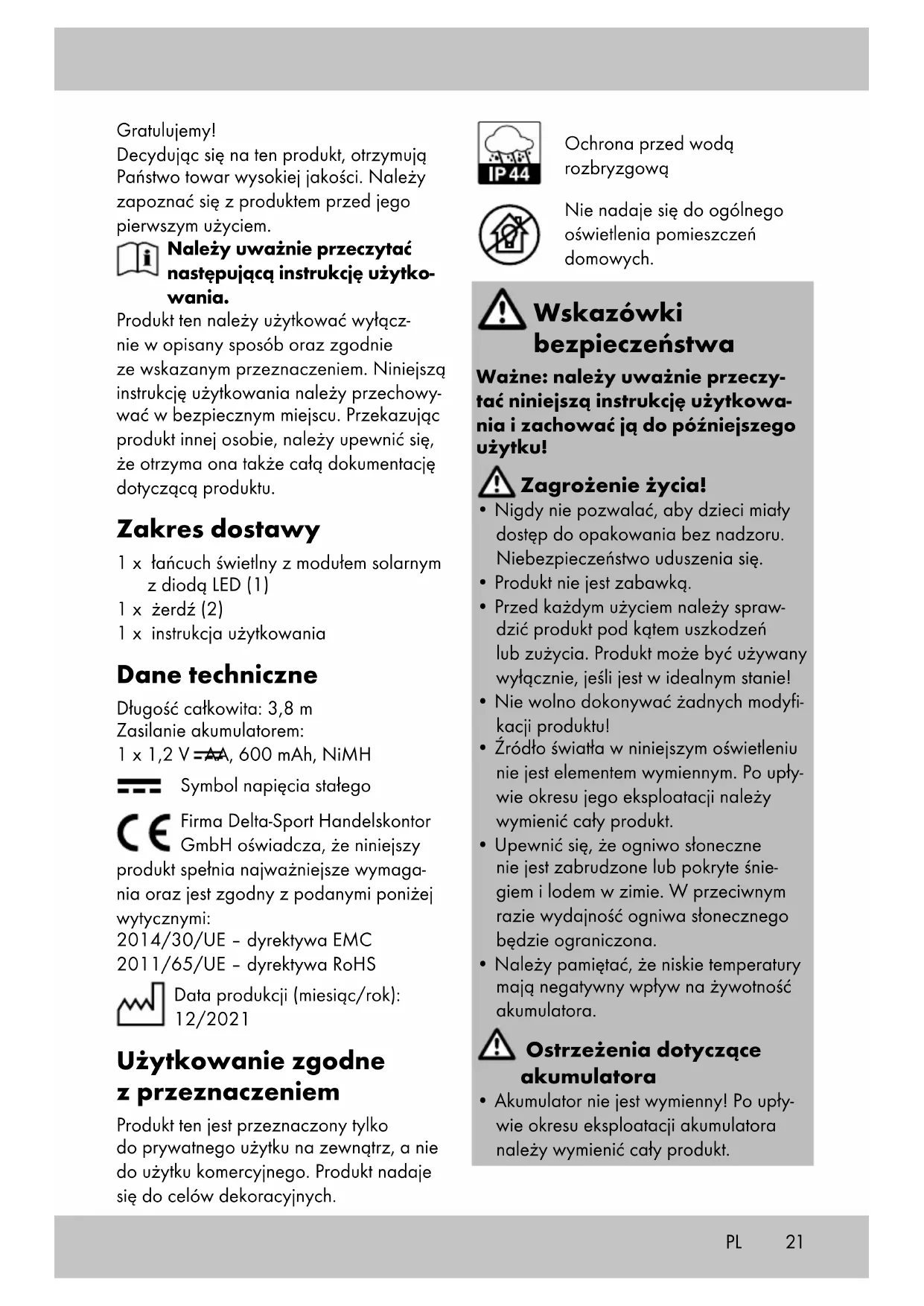 - Ustawić przełącznik wł./wył w pozy- cji „OFF” (wył.). Produkt jest trwale wyłączony.23 Przechowywanie, czyszczenie Nieużywany produkt należy zawsze przechowywać wyłączony, w suchym i czystym miejscu, w temperaturze pokojo- wej. Część zewnętrzną czyścić wyłącznie przy użyciu wilgotnej ściereczki, następnie wytrzeć do sucha. WAŻNE! Nie czyścić przy użyciu ostrych środków czyszczących. Uwagi odnośnie recyklingu Jeśli produkt jest zużyty, nie należy go wyrzucać wraz z odpadami domowymi ze względu na ochronę środowiska, ale należy go odpowiednio zutylizować. Informacje o punktach zbiórki i godzinach otwarcia można uzyskać w lokalnej administracji. Uszkodzone lub zużyte baterie/aku- mulatory należy poddać recyklingowi zgodnie z dyrektywą 2006/66/WE i jej zmianami. Zwrócić baterie/akumulatory i/ lub produkt, korzystając z udostępnionych urządzeń przeznaczonych do zbiórki. Opakowania, takie jak torby plastikowe, nie powinny znaleźć się w rękach dzieci. Opakowanie przechowywać w miejscu niedostępnym dla dzieci. Nieprawidłowa utylizacja baterii/ akumulatorów wyrządza szkody w środowisku naturalnym! Baterii/ akumulatorów nie wolno wyrzucać razem z odpadami domowymi. Mogą zawierać toksyczne metale ciężkie i podlegają obróbce odpadów niebezpiecznych. Symbole chemiczne metali ciężkich są następujące: Cd = kadm, Hg = rtęć, Pb = ołów. Zużyte baterie/akumulatory należy oddawać w miejskim punkcie zbiórki. Produkt oraz opakowanie należy utylizować w sposób przyjazny dla środowiska. Przestrzegać oznakowania materiałów opakowaniowych podczas segregacji odpadów. Są one oznaczone skrótami (a) i liczbami (b) o następującym znaczeniu: 1–7: tworzywa sztuczne/20–22: papier i karton/80–98: materiały kompozytowe. Produkt i materiały opakowaniowe na- dają się do recyklingu, należy je osobno zutylizować w celu lepszego przetwarza- nia odpadów. Logo Triman obowiązuje tylko we Francji. Informacje o sposobie utylizacji zużytego produktu są dostępne u władz lokalnych lub miejskich. Wskazówki dotyczące gwarancji i obsługi serwisowej Artykuł został wyprodukowany z najwyż- szą starannością i pod stałą kontrolą. DELTA-SPORT HANDELSKONTOR GmbH przyznaje klientowi końcowemu na niniej- szy artykuł trzy lata gwarancji od daty zakupu (okres gwarancyjny) z zastrzeże- niem poniższych postanowień. Gwarancja dotyczy wyłącznie wad materiałowych i wad wykonania. Gwarancja nie obejmuje części, które podlegają normalnemu zuży- ciu i z tego względu należy je traktować jako części zużywalne (np. baterie) i nie obejmuje części kruchych, np. przełącz- ników, akumulatorów ani części wykona- nych ze szkła. Wyklucza się roszczenia z tytułu niniejszej gwarancji w przypadku użycia artykułu w sposób niewłaściwy lub sprzeczny z jego przeznaczeniem lub w sposób wykracza- jący poza przewidziane przeznaczenie lub poza przewidziany zakres użytkowa- nia lub jeśli wytyczne zawarte w instrukcji obsługi nie były przestrzegane, chyba że klient końcowy udowodni istnienie wady materiałowej lub wady wykonania, która nie wynika z podanych wyżej przyczyn. PL24 PL Roszczenia z tytułu gwarancji można zgła- szać wyłącznie w okresie gwarancyjnym za okazaniem oryginalnego dowodu za- kupu. Prosimy zatem zachować oryginalny dowód zakupu! W przypadku jakichkolwiek reklamacji prosimy skontaktować się z nami najpierw za pośrednictwem podanej poniżej infolinii serwisowej lub drogą e-mailową. W przypadku objętym gwarancją artykuł zostanie – według naszego uznania – bezpłatnie naprawiony, wymieniony lub nastąpi zwrot ceny zakupu. Z gwarancji nie wynikają żadne inne prawa. Niniejsza gwarancja nie ogranicza Pań- stwa ustawowych praw, w szczególności roszczeń gwarancyjnych wobec danego sprzedawcy. W przypadku wymiany części lub całego artykułu okres gwarancji przedłuża się o trzy lata zgodnie z art. 581 § 1 kodeksu cywilnego. Po upłynięciu czasu gwarancji powstałe naprawy są płatne. IAN: 398838_2107 Serwis Polska Tel.: 22 397 4996 E-Mail: deltasport@lidl.pl25 Srdečně blahopřejeme! Svým nákupem jste se rozhodli pro kvalitní výrobek. Před prvním použitím se prosím seznamte s tímto výrobkem. Pozorně si přečtete následují- cí návod k použití. Používejte tento výrobek pouze tak, jak je popsáno, a pro uvedené účely. Uschovejte si tento návod k použití pro budoucí po- užití. Pokud výrobek předáte třetí osobě, předejte jí i veškerou dokumentaci. Obsah balení 1 x světelný řetěz se solárním modulem vč. LED (1) 1 x hrot do země (2) 1 x návod k použití Technické údaje Celková délka: 3,8 m Zdroj energie akumulátoru: 1 x 1,2 V AA, 600 mAh, NiMH Symbol pro stejnosměrné napětí Společnost Delta-Sport Handel- skontor GmbH tímto prohlašuje, že tento výrobek je v souladu s následující- mi základními požadavky a ostatními příslušnými ustanoveními: 2014/30/EU – Směrnice o EMK 2011/65/EU – Směrnice RoHS Datum výroby (měsíc/rok): 12/2021 Použití dle určení Výrobek je určen jen pro soukromé použití ve venkovních prostorách a není určen pro komerční využití. Výrobek je vhodný pro dekorační účely. Ochrana proti stříkající vodě Není obecně určen k osvětlení místností v domácnosti. Bezpečnostní pokyny Důležité: Přečtěte si pozorně ná- vod k použití a uschovejte si jej! Nebezpečí ohrožení života!