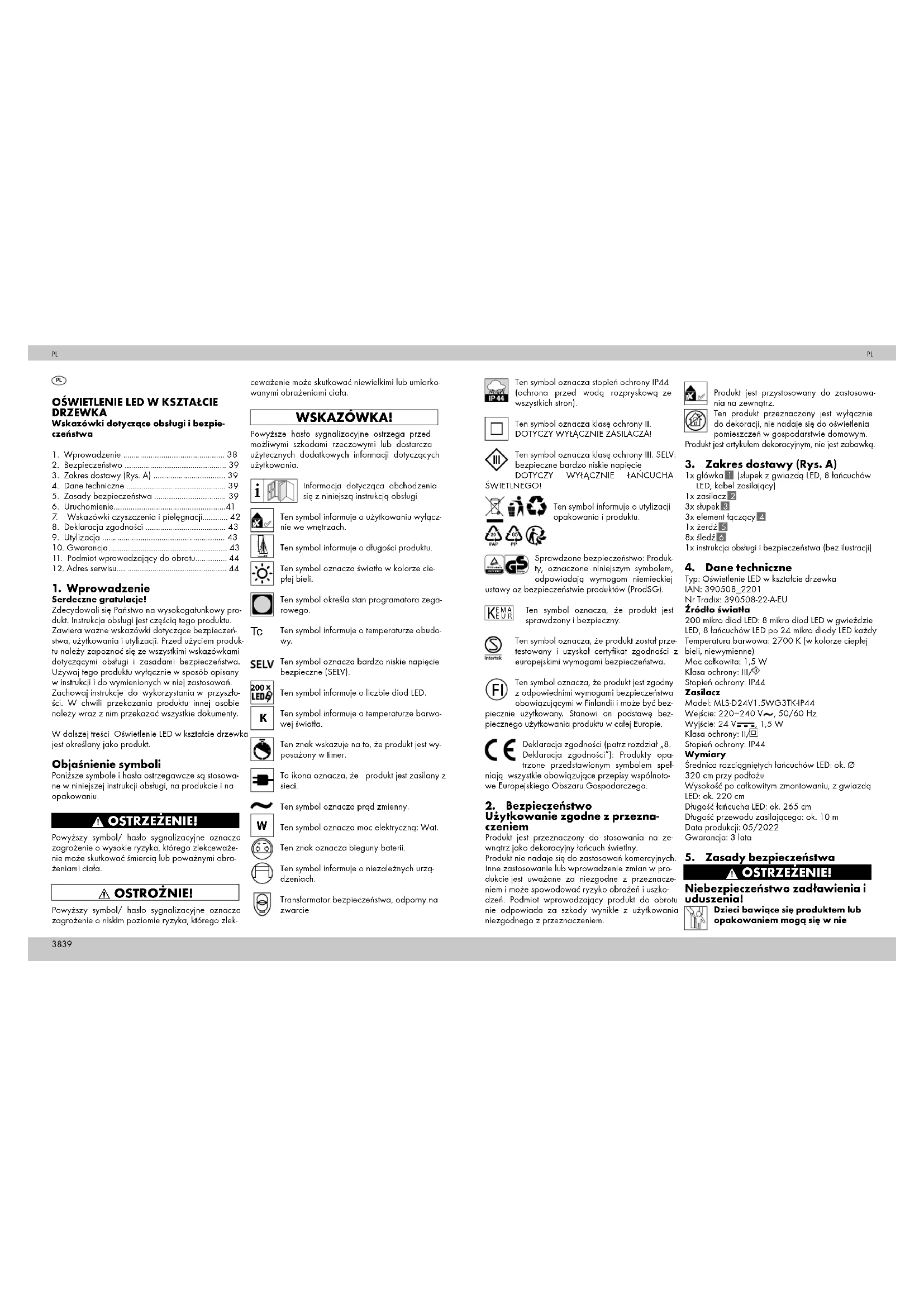TRADIX SERVICE-CENTER c/o Teknihall Elektronik GmbH Assar-Gabrielsson-Str. 11-13 DE-63128 Dietzenbach/GERMANY Hotline: 00800 / 30012001 (Połączenie bezpłat- ne z telefonu stacjonarnego. Połączenie z telefonu komórkowego płatne według stawki operatora) E-Mail: tradix-pl@teknihall.com 05/2022 Nr Tradix: 390508-22-A-EU IAN 390508_2201 PL46 47 Tento znak označuje ochrannú triedu II. PLATÍ LEN PRE SIEŤOVÝ ADAPTÉR! Tento znak označuje ochrannú triedu III. SELV: bezpečné extra nízke napätie PLATÍ LEN PRE SVETELNÚ REŤAZ!