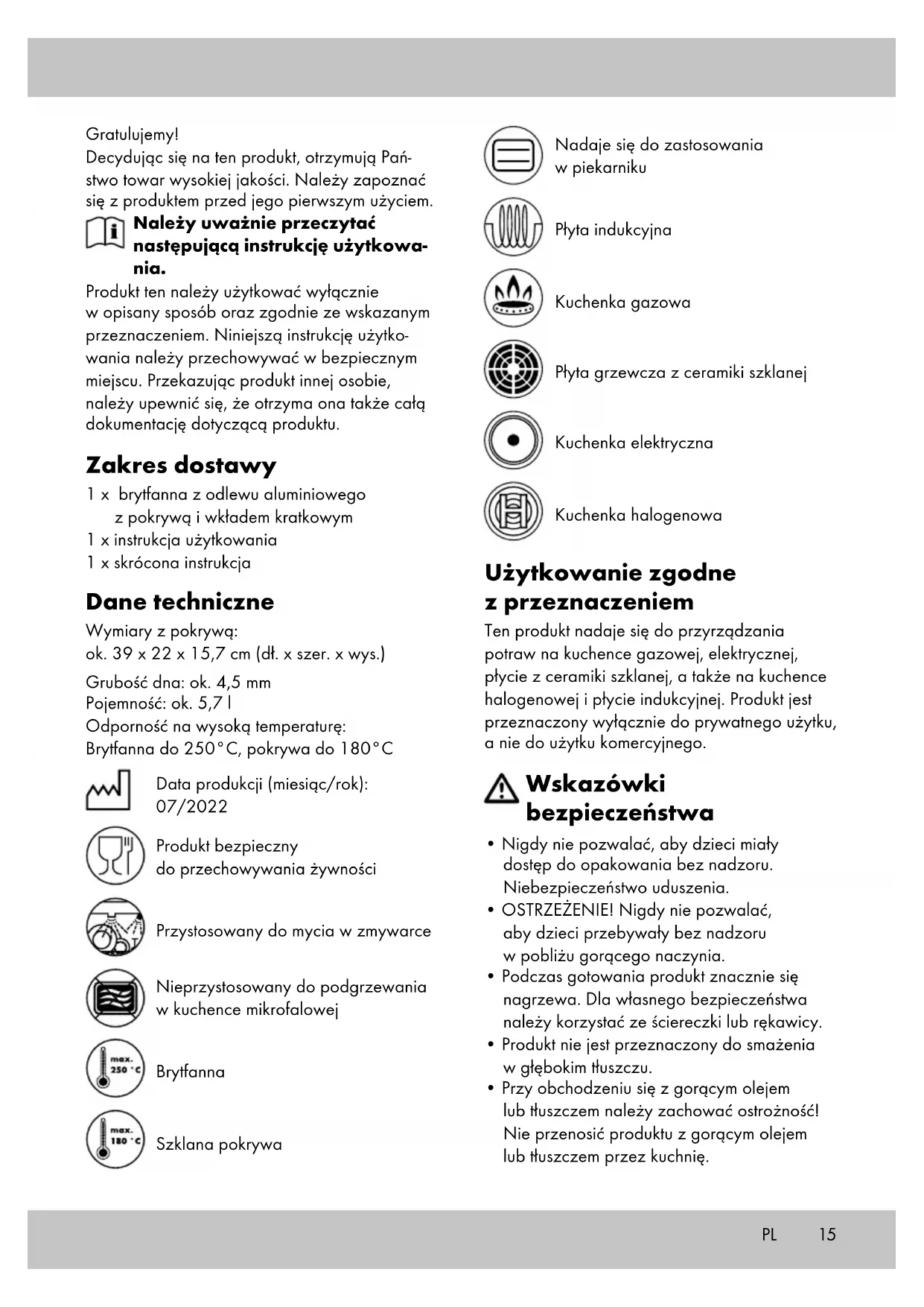 - WAŻNE! Nie czyścić przy użyciu ostrych środków czyszczących. Uwagi odnośnie recyklingu Artykuł oraz materiały opakowaniowe nale- ży usunąć zgodnie z aktualnymi przepisami obowiązującymi w danym miejscu. Materiały opakowaniowe, jak np. worki foliowe nie powinny znaleźć się w rękach dzieci. Materiał opakowaniowy należy przechowywać w miej- scu niedostępnym dla dzieci. Zutylizować produkt i opakowanie w sposób przyjazny dla środowiska.17 Kod materiału do recyklingu służy do oznaczenia różnych materiałów przeznaczonych do zwrotu do przetwór- stwa wtórnego (recyklingu). Kod składa się z symbolu, który powinien odzwierciedlać cykl odzysku, oraz numeru oznaczającego materiał. Wskazówki dotyczące gwa- rancji i obsługi serwisowej Artykuł został wyprodukowany z najwyższą starannością i pod stałą kontrolą. DELTA-SPORT HANDELSKONTOR GmbH przyznaje klien- towi końcowemu na niniejszy artykuł trzy lata gwarancji od daty zakupu (okres gwarancyjny) z zastrzeżeniem poniższych postanowień. Gwa- rancja dotyczy wyłącznie wad materiałowych i wad wykonania. Gwarancja nie obejmuje części, które podlegają normalnemu zużyciu i z tego względu należy je traktować jako części zużywalne (np. baterie) i nie obejmuje części kruchych, np. przełączników, akumulatorów ani części wykonanych ze szkła. Wyklucza się roszczenia z tytułu niniejszej gwa- rancji w przypadku użycia artykułu w sposób niewłaściwy lub sprzeczny z jego przeznacze- niem lub w sposób wykraczający poza przewi- dziane przeznaczenie lub poza przewidziany zakres użytkowania lub jeśli wytyczne zawarte w instrukcji obsługi nie były przestrzegane, chyba że klient końcowy udowodni istnienie wady materiałowej lub wady wykonania, która nie wynika z podanych wyżej przyczyn. Roszczenia z tytułu gwarancji można zgłaszać wyłącznie w okresie gwarancyjnym za okaza- niem oryginalnego dowodu zakupu. Prosimy zatem zachować oryginalny dowód zakupu! W przypadku jakichkolwiek reklamacji prosimy skontaktować się z nami najpierw za pośred- nictwem podanej poniżej infolinii serwisowej lub drogą e-mailową. W przypadku objętym gwarancją artykuł zostanie – według naszego uznania – bezpłatnie naprawiony, wymieniony lub nastąpi zwrot ceny zakupu. Z gwarancji nie wynikają żadne inne prawa. Niniejsza gwarancja nie ogranicza Państwa ustawowych praw, w szczególności roszczeń gwarancyjnych wobec danego sprzedawcy. W przypadku wymiany części lub całego arty- kułu okres gwarancji przedłuża się o trzy lata zgodnie z art. 581 § 1 kodeksu cywilnego. Po upłynięciu czasu gwarancji powstałe naprawy są płatne. IAN: 390017_2201 Serwis Polska Tel.: 22 397 4996 E-Mail: deltasport@lidl.pl PL18 Srdečně blahopřejeme! Svým nákupem jste se rozhodli pro kvalitní výro- bek. Před prvním použitím se prosím seznamte s tímto výrobkem. Pozorně si přečtete následující návod k použití. Používejte tento výrobek pouze tak, jak je popsáno, a pro uvedené účely. Uschovejte si tento návod k použití pro budoucí použití. Pokud výrobek předáte třetí osobě, předejte jí i veške- rou dokumentaci. Obsah balení 1 x pekáč z hliníkové litiny s poklicí a vloženým roštem 1 x návod k použití 1 x stručný návod Technické údaje Rozměry s poklicí: cca 39 x 22 x 15,7 cm (d x š x v) Tloušťka dna: cca 4,5 mm Objem: cca 5,7 l Žáruvzdornost: Pekáč do 250 °C, poklice do 180 °C Datum výroby (měsíc/rok): 07/2022 Vhodný pro potraviny Vhodný do myčky nádobí Výrobek není vhodný do mikrovlnné trouby Pekáč Skleněná poklice Vhodný do trouby Indukční plotýnka Plynový sporák Sklokeramické varná plocha Elektrický sporák Halogenová varná deska Použití dle určení Výrobek je vhodný pro přípravu potravin na plynových, elektrických, sklokeramických, halogenových a indukčních varných deskách. Výrobek je určen jen pro soukromé použití a není určen pro komerční využití. Bezpečnostní pokyny