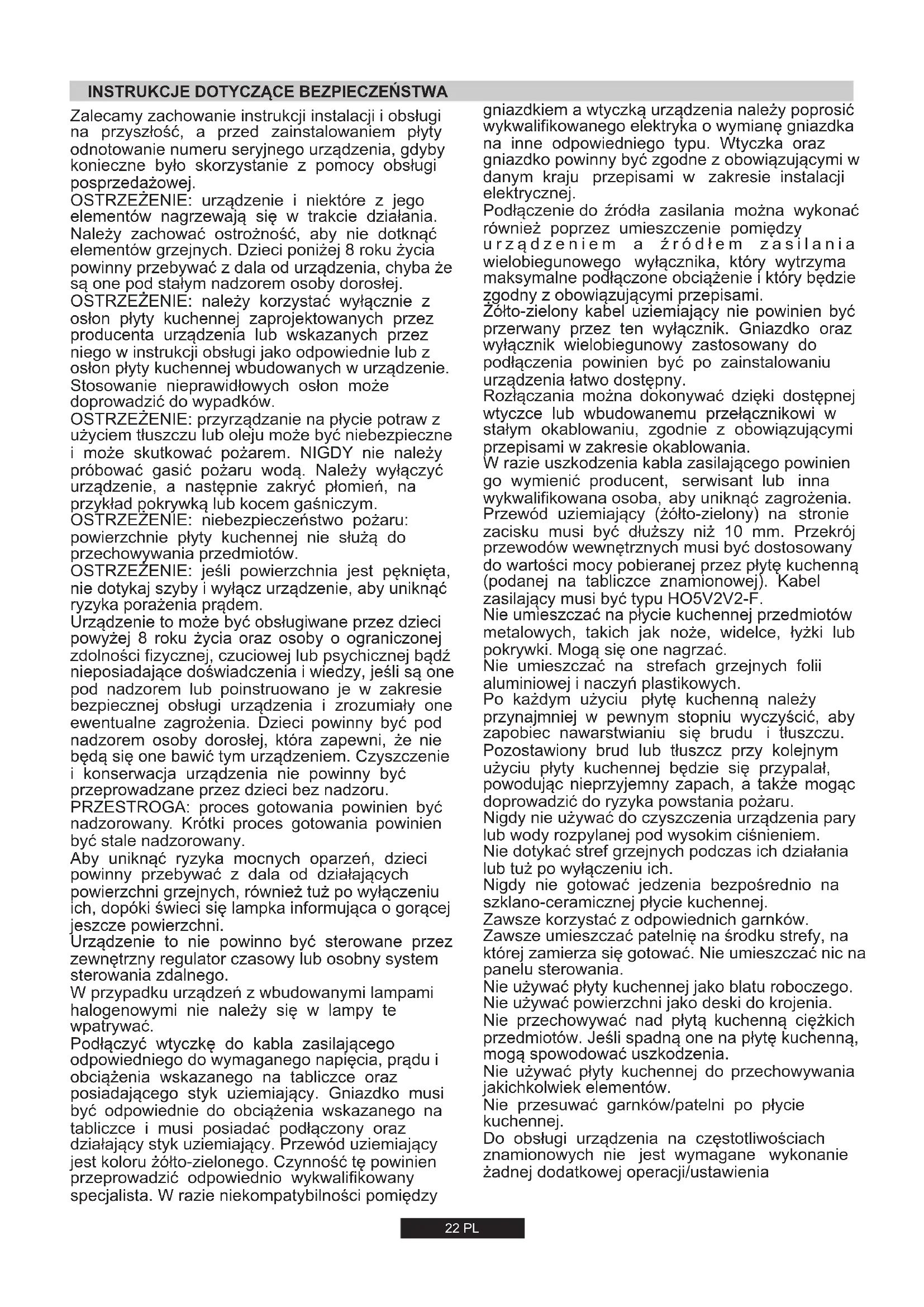 INSTALACJA URZĄDZENIA DOMOWEGO MOŻE BYĆ SKOMPLIKOWANĄ OPERACJĄ, KTÓRA JEŻELI NIE BĘDZIE WYKONANA PRAWIDŁOWO, MOŻE POWAŻNIE ZAGROZIĆ BEZPIECZEŃSTWU UŻYTKOWNIKA. DLATEGO TEŻ, ZADANIE TO POWINNO BYĆ WYKONANE PRZEZ OSOBĘ O ODPOWIEDNICH KWALIFIKACJACH ORAZ ZGODNIE Z OBOWIĄZUJĄCYMI PRZEPISAMI. W PRZYPADKU ZIGNOROWANIA NINIEJSZEGO ZALECENIA I WYKONANIA INSTALACJI PRZEZ OSOBĘ BEZ ODPOWIEDNICH KWALIFIKACJI, PRODUCENT NIE PONOSI ŻADNEJ ODPOWIEDZIALNOŚCI ZA JAKIEKOLWIEK USTERKI TECHNICZNE, BEZ WZGLĘDU NA TO, CZY SPOWODUJĄ ONE SZKODY W MIENIU, CZY TEŻ USZKODZENIA CIAŁA U LUDZI. Przewód uziemienia (w kolorze żółtozielonym) musi być co najmniej 10 mm dłuższy niż przewód fazowy i neutralny. Przekrój poprzeczny kabla zasilającego musi być o wielkości dostosowanej do mocy pobieranej przez płytę. Sprawdzić na tabliczce znamionowej dane dotyczące podłączenia do sieci elektrycznej oraz upewnić się, że kabel zasilający jest typu 3x0.75 mm² H05 V2V2-F.