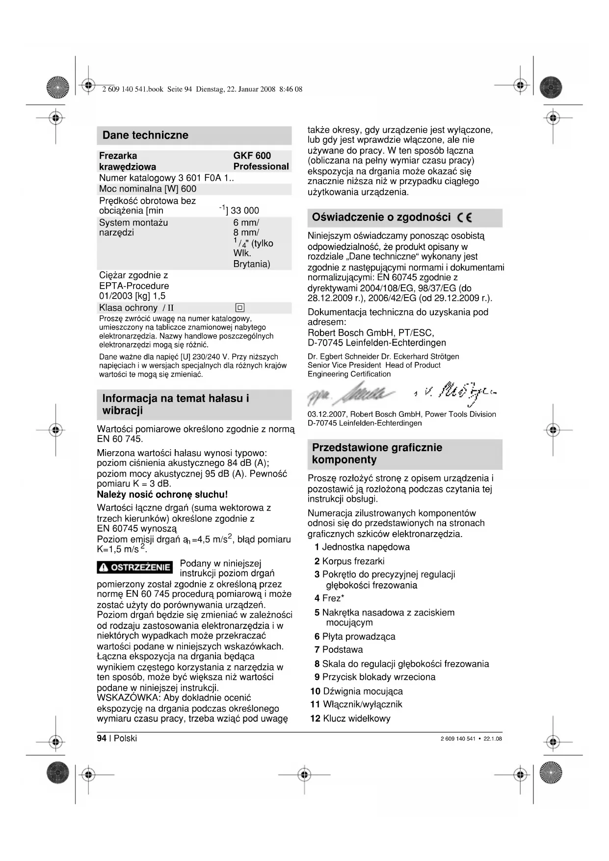 Podany w niniejszej instrukcji poziom drgaµ pomierzony zosta∆ zgodnie z okre∂lonå przez norm∑ EN 60 745 procedurå pomiarowå i mo†e zostaç u†yty do porøwnywania urzådzeµ. Poziom drgaµ b∑dzie si∑ zmieniaç w zale†no∂ci od rodzaju zastosowania elektronarz∑dzia i w niektørych wypadkach mo†e przekraczaç warto∂ci podane w niniejszych wskazøwkach. ˆåczna ekspozycja na drgania b∑dåca wynikiem cz∑stego korzystania z narz∑dzia w ten sposøb, mo†e byç wi∑ksza ni† warto∂ci podane w niniejszej instrukcji. WSKAZÓWKA: Aby dok∆adnie oceniç ekspozycj∑ na drgania podczas okre∂lonego wymiaru czasu pracy, trzeba wziåç pod uwag∑ tak†e okresy, gdy urzådzenie jest wy∆åczone, lub gdy jest wprawdzie w∆åczone, ale nie u†ywane do pracy. W ten sposøb ∆åczna (obliczana na pe∆ny wymiar czasu pracy) ekspozycja na drgania mo†e okazaç si∑ znacznie ni†sza ni† w przypadku ciåg∆ego u†ytkowania urzådzenia. Niniejszym o∂wiadczamy ponoszåc osobistå odpowiedzialno∂ç, †e produkt opisany w rozdziale „Dane techniczne“ wykonany jest zgodnie z nast∑pujåcymi normami i dokumentami normalizujåcymi: EN 60745 zgodnie z dyrektywami 2004/108/EG, 98/37/EG (do