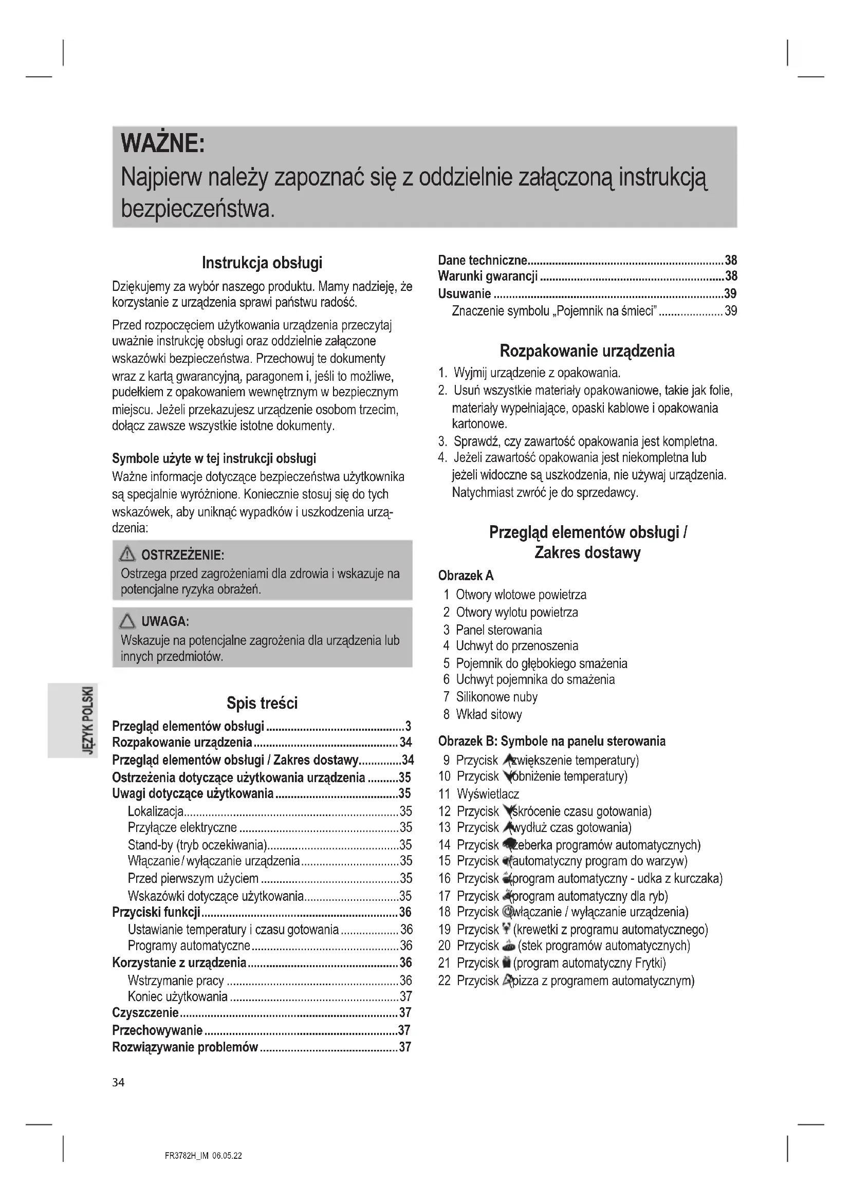 jeżeli widoczne są uszkodzenia, nie używaj urządzenia. Natychmiast zwróć je do sprzedawcy. Przegląd elementów obsługi / Zakres dostawy Obrazek A 1 Otwory wlotowe powietrza 2 Otwory wylotu powietrza 3 Panel sterowania 4 Uchwyt do przenoszenia 5 Pojemnik do głębokiego smażenia 6 Uchwyt pojemnika do smażenia 7 Silikonowe nuby 8 Wkład sitowy Obrazek B: Symbole na panelu sterowania 9 Przycisk (zwiększenie temperatury) 10 Przycisk (obniżenie temperatury) 11 Wyświetlacz 12 Przycisk (skrócenie czasu gotowania) 13 Przycisk (wydłuż czas gotowania) 14 Przycisk (żeberka programów automatycznych) 15 Przycisk (automatyczny program do warzyw) 16 Przycisk (program automatyczny - udka z kurczaka) 17 Przycisk (program automatyczny dla ryb) 18 Przycisk (włączanie / wyłączanie urządzenia) 19 Przycisk (krewetki z programu automatycznego) 20 Przycisk (stek programów automatycznych) 21 Przycisk (program automatyczny Frytki) 22 Przycisk (pizza z programem automatycznym)FR3782H_IM 06.05.22