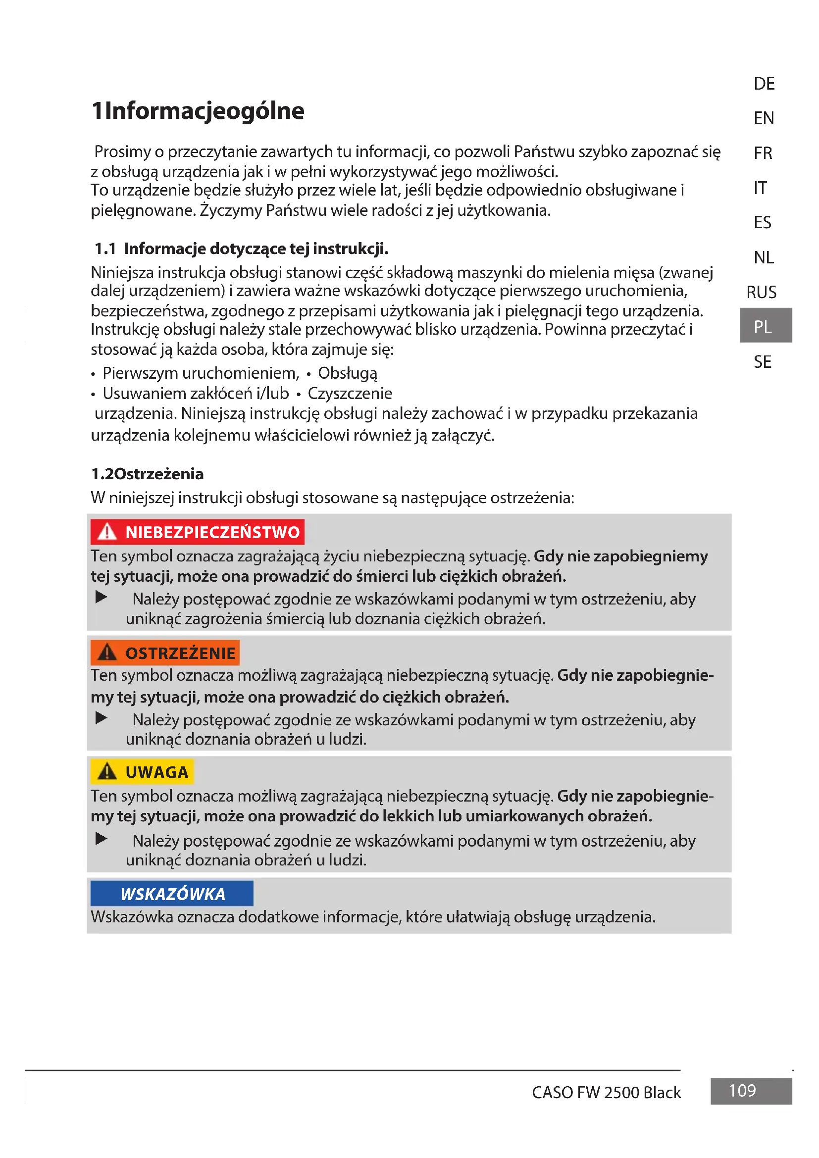 W niniejszej instrukcji obsługi stosowane są następujące ostrzeżenia: NIEBEZPIECZEŃSTWO Ten symbol oznacza zagrażającą życiu niebezpieczną sytuację. Gdy nie zapobiegniemy tej sytuacji, może ona prowadzić do śmierci lub ciężkich obrażeń. Należy postępować zgodnie ze wskazówkami podanymi w tym ostrzeżeniu, aby uniknąć zagrożenia śmiercią lub doznania ciężkich obrażeń. OSTRZEŻENIE Ten symbol oznacza możliwą zagrażającą niebezpieczną sytuację. Gdy nie zapobiegnie- my tej sytuacji, może ona prowadzić do ciężkich obrażeń. Należy postępować zgodnie ze wskazówkami podanymi w tym ostrzeżeniu, aby uniknąć doznania obrażeń u ludzi. UWAGA Ten symbol oznacza możliwą zagrażającą niebezpieczną sytuację. Gdy nie zapobiegnie- my tej sytuacji, może ona prowadzić do lekkich lub umiarkowanych obrażeń. Należy postępować zgodnie ze wskazówkami podanymi w tym ostrzeżeniu, aby uniknąć doznania obrażeń u ludzi. WSKAZÓWKA Wskazówka oznacza dodatkowe informacje, które ułatwiają obsługę urządzenia.110 CASO FW 2500 Black