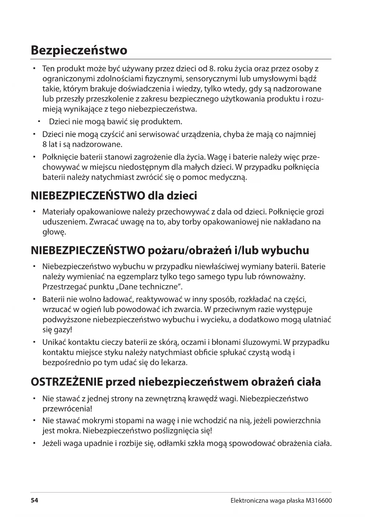 Elektroniczna waga płaska M316600 Bezpieczeństwo Ten produkt może być używany przez dzieci od 8. roku życia oraz przez osoby z ograniczonymi zdolnościami zycznymi, sensorycznymi lub umysłowymi bądź takie, którym brakuje doświadczenia i wiedzy, tylko wtedy, gdy są nadzorowane lub przeszły przeszkolenie z zakresu bezpiecznego użytkowania produktu i rozu- mieją wynikające z tego niebezpieczeństwa. Dzieci nie mogą bawić się produktem. Dzieci nie mogą czyścić ani serwisować urządzenia, chyba że mają co najmniej 8lat i są nadzorowane. Połknięcie baterii stanowi zagrożenie dla życia. Wagę i baterie należy więc prze- chowywać w miejscu niedostępnym dla małych dzieci. W przypadku połknięcia baterii należy natychmiast zwrócić się o pomoc medyczną. NIEBEZPIECZEŃSTWO dla dzieci Materiały opakowaniowe należy przechowywać z dala od dzieci. Połknięcie grozi uduszeniem. Zwracać uwagę na to, aby torby opakowaniowej nie nakładano na głowę. NIEBEZPIECZEŃSTWO pożaru/obrażeń i/lub wybuchu Niebezpieczeństwo wybuchu w przypadku niewłaściwej wymiany baterii. Baterie należy wymieniać na egzemplarz tylko tego samego typu lub równoważny. Przestrzegać punktu „Dane techniczne”. Baterii nie wolno ładować, reaktywować w inny sposób, rozkładać na części, wrzucać w ogień lub powodować ich zwarcia. W przeciwnym razie występuje podwyższone niebezpieczeństwo wybuchu i wycieku, a dodatkowo mogą ulatniać się gazy! Unikać kontaktu cieczy baterii ze skórą, oczami i błonami śluzowymi. W przypadku kontaktu miejsce styku należy natychmiast obcie spłukać czystą wodą i bezpośrednio po tym udać się do lekarza. OSTRZEŻENIE przed niebezpieczeństwem obrażeń ciała Nie stawać z jednej strony na zewnętrzną krawędź wagi. Niebezpieczeństwo przewrócenia! Nie stawać mokrymi stopami na wagę i nie wchodzić na nią, jeżeli powierzchnia jest mokra. Niebezpieczeństwo poślizgnięcia się! Jeżeli waga upadnie i rozbije się, odłamki szkła mogą spowodować obrażenia ciała.Użycie zgodne z przeznaczeniem
