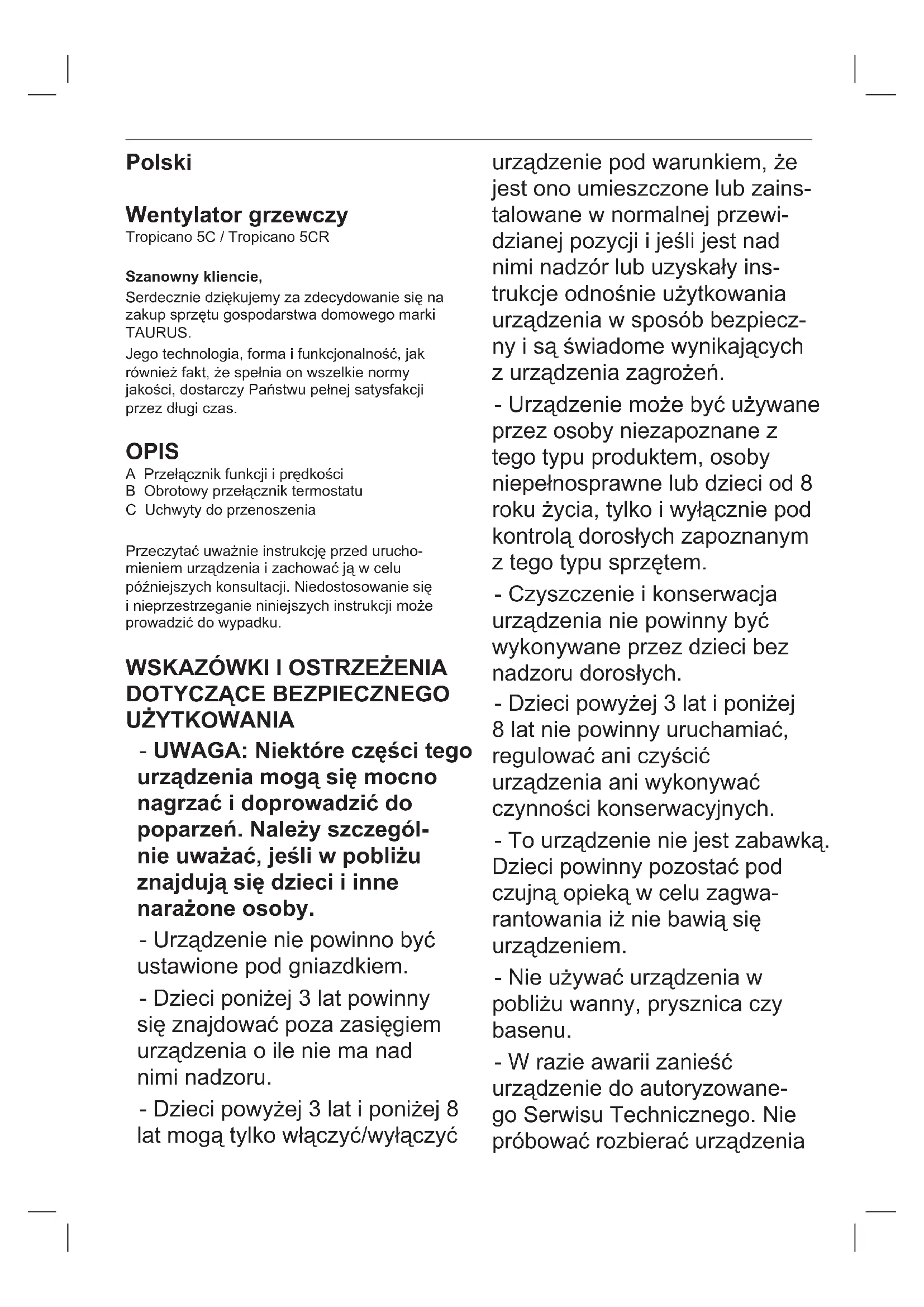 Met elektronische regeling van inwendige temperatuur Nee Elektronische regeling inwendige temperatuur en dagelijkse timer Nee Elektronische regeling inwendige temperatuur en wekelijkse timer Nee Andere besturingssystemen Regeling inwendige temperatuur met aanwezigheidsdetectie Nee Regeling inwendige temperatuur met detectie open ramen Nee Met optionele afstandsbediening Nee Met instelbare inschakeling Nee Met beperking van werkingsduur Nee Met zwartlichtlamp sensor Nee Contactgegevens "ELECTRODOMÉSTICOS TAURUS, S.L. Avda. Barcelona S/N 25790 Oliana, Lleida, Spain”Polski Wentylator grzewczy Tropicano 5C / Tropicano 5CR Szanowny kliencie, Serdecznie dziękujemy za zdecydowanie się na zakup sprzętu gospodarstwa domowego marki TAURUS. Jego technologia, forma i funkcjonalność, jak również fakt, że spełnia on wszelkie normy jakości, dostarczy Państwu pełnej satysfakcji przez długi czas. OPIS A Przełącznik funkcji i prędkości B Obrotowy przełącznik termostatu C Uchwyty do przenoszenia Przeczytać uważnie instrukcję przed urucho- mieniem urządzenia i zachować ją w celu późniejszych konsultacji. Niedostosowanie się i nieprzestrzeganie niniejszych instrukcji może prowadzić do wypadku.
