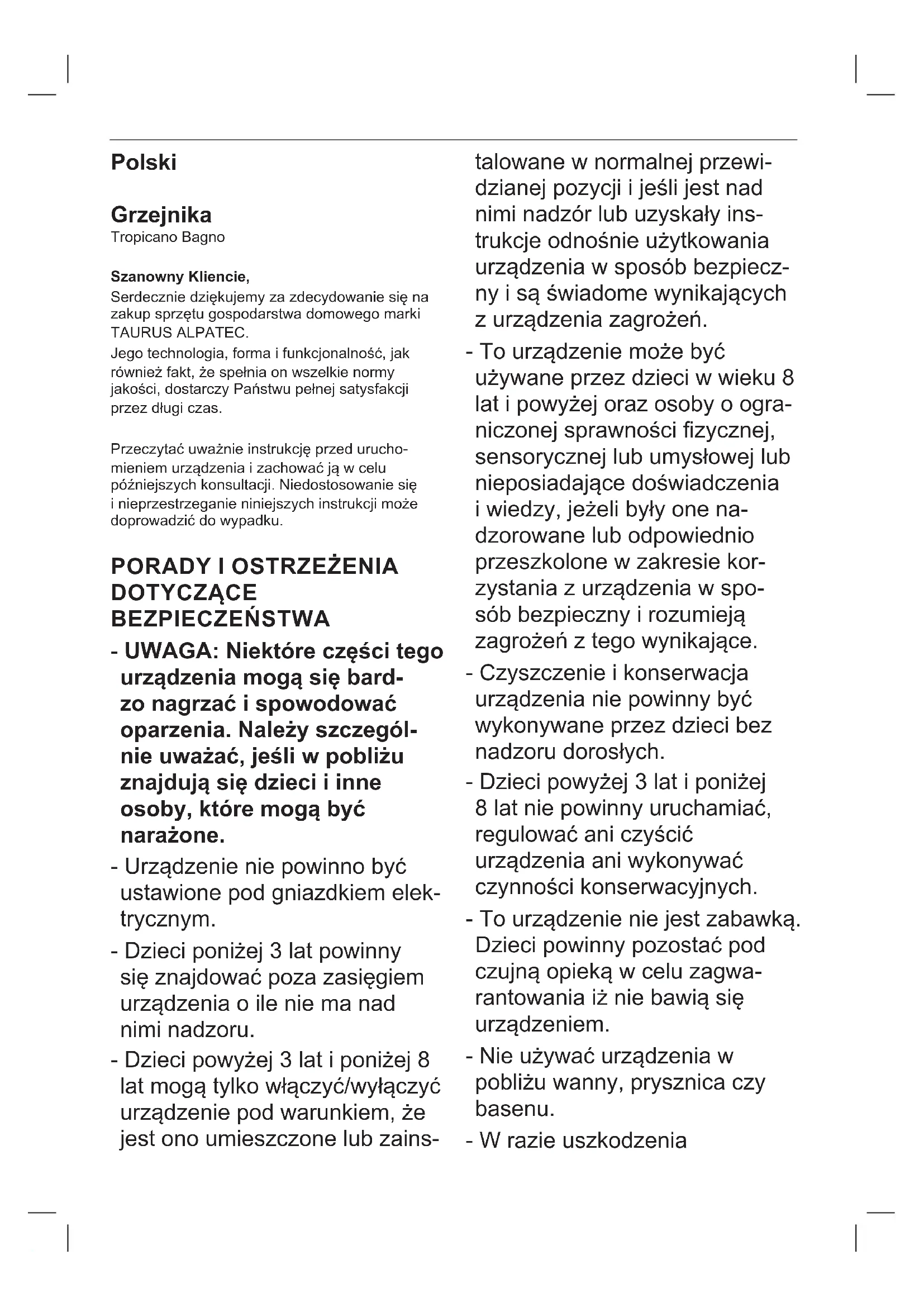 INSTRUKCJA OBSŁUGI Tropicano Bagno TAURUS