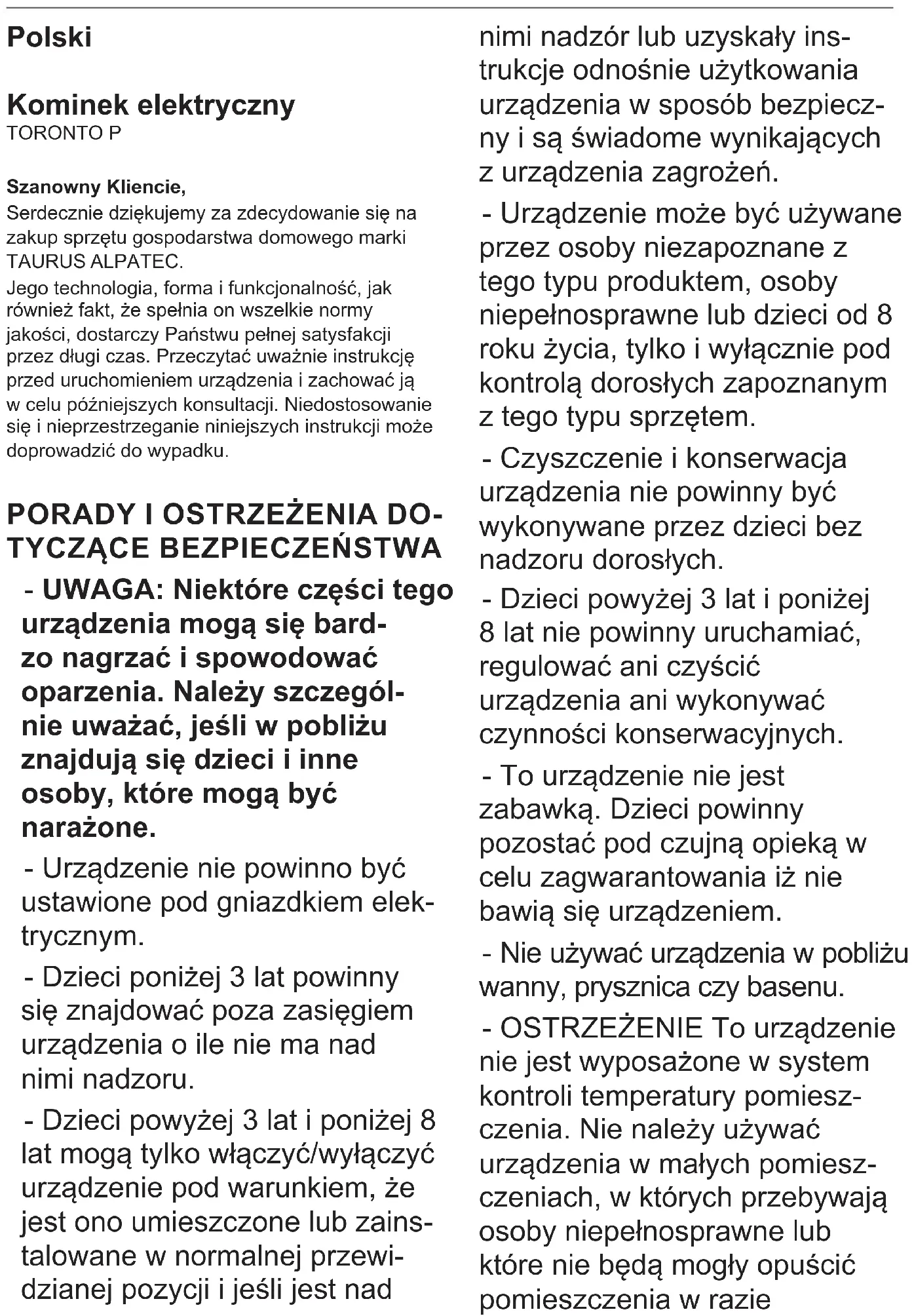 0,0003kW Sposób doprowadzania ciepła wyłącznie w przypadku elektrycznych akumulacyjnych miej- scowych ogrzewaczy pomieszczeń Ręczny regulator doprowadzania ciepła z wbudowanym termostatem N/A Ręczny regulator doprowadzania ciepła z pomiarem temperatury w pomieszczeniu lub na zewnątrz N/A Elektroniczny regulator doprowadzania ciepła z pomiarem tempera- tury w pomieszczeniu lub na zewnątrz N/A Moc cieplna regulowana wentylatorem N/A Typ monitorowania mocą cieplną/temperaturą wnętrza Moc cieplna tylko jednego poziomu, bez kontrolowania temperatury pomieszczenia Nie Dwa lub więcej poziomy manualne, bez kontrolowania temperatury pomieszczenia Nie Z kontrolowaniem temperatury pomieszczenia poprzez termostat mechaniczny Nie Z kontrolowaniem elektronicznym temperatury pomieszczenia Nie Kontrolowanie elektroniczne temperatury pomieszczenia i czasomierz dzienny Nie Kontrolowanie elektroniczne temperatury pomieszczenia i czasomierz tygodniowy Tak Inne opcje kontroli Kontrolowanie temperatury pomieszczenia z wykrywaniem obecności Nie Kontrolowanie temperatury pomieszczenia z wykrywaniem otwartych okien Tak Z opcją kontrolowania odległości Nie Z kontrolowaniem uruchamiania adaptacyjnego Nie Z ograniczeniem czasu funkcjonowania Nie Z czujnikiem czarnej lampy Nie Dane teleadresowe "ELECTRODOMÉSTICOS TAURUS, S.L. Avda. Barcelona S/N 25790 Oliana, Lleida, Spain”Ελληνικά Ηλεκτρικό τζάκι TORONTO P Αξιότιμε πελάτη: Σας ευχαριστούμε που αποφασίσατε να αγοράσετε ένα προϊόν μάρκας TAURUS ALPA- TEC. Η τεχνολογία, ο σχεδιασμός και η λειτουργία του, σε συνδυασμό με το γεγονός ότι το προϊόν πληροί τις αυστηρότερες προδιαγραφές ποιότητας θα σας εξασφαλίσουν πλήρη ικανοποίηση για πολύ